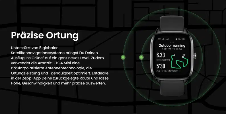 Für ein verbessertes Tracking sollen die fünf Satellitennavigationssysteme inklusive GPS sorgen. So soll beispielsweise auch die Route auf der Uhr angezeigt werden. Spannend wird das besonders beim Joggen oder Fahrradfahren, welches zwei der sieben Sportmodi sind, die die automatische Trainingserkennung unterstützt.