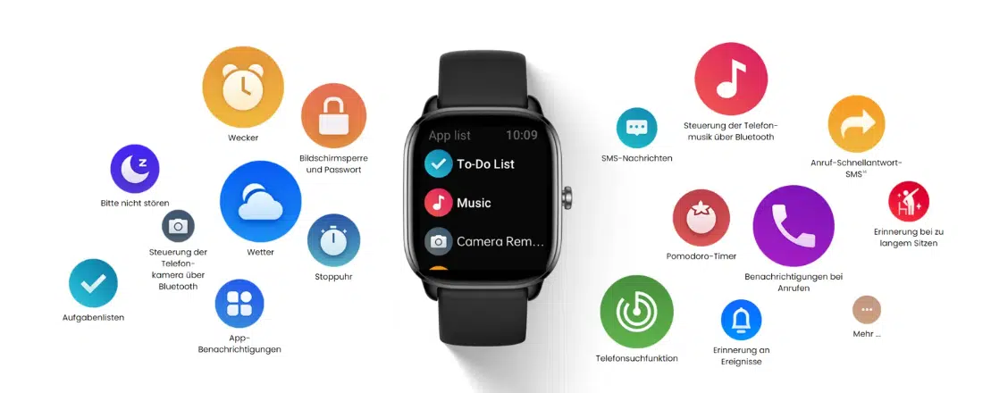 Wie man auch schon von der Amazfit GTR 3 Pro kennt, befinden sich zusätzlich noch 10 Mini-Apps mit auf der Smartwatch. Genutzt und verbunden wird alles per Bluetooth 5.2 BLE und wie man es gewohnt ist, kommt die Zepp-App zum Einsatz.
