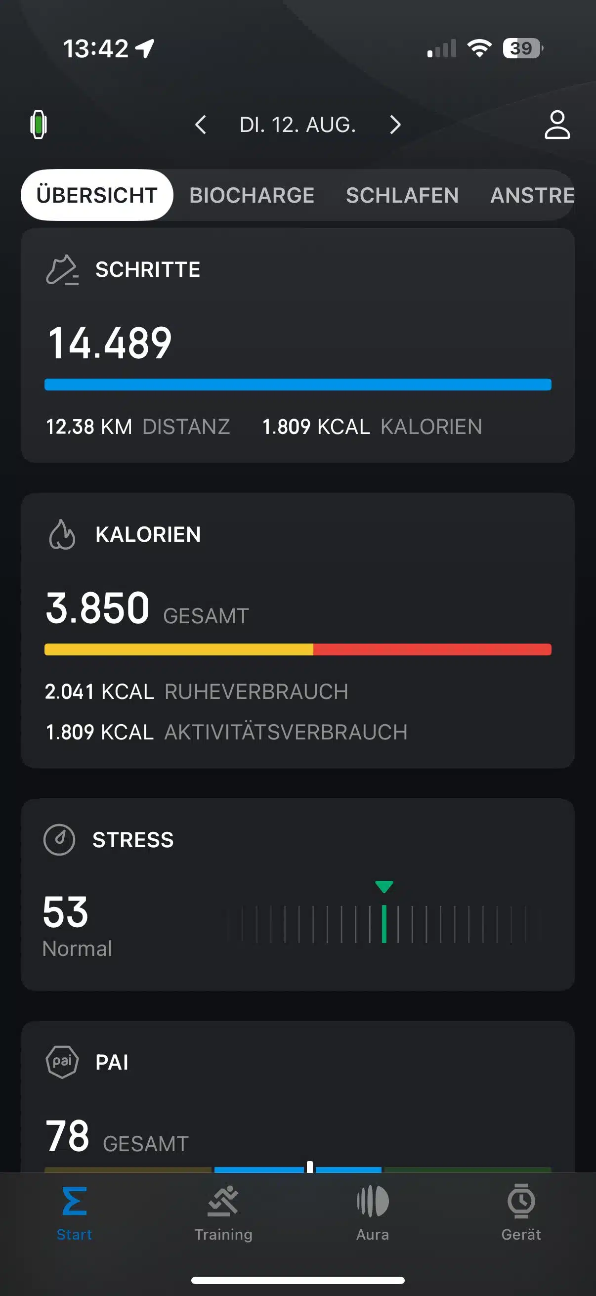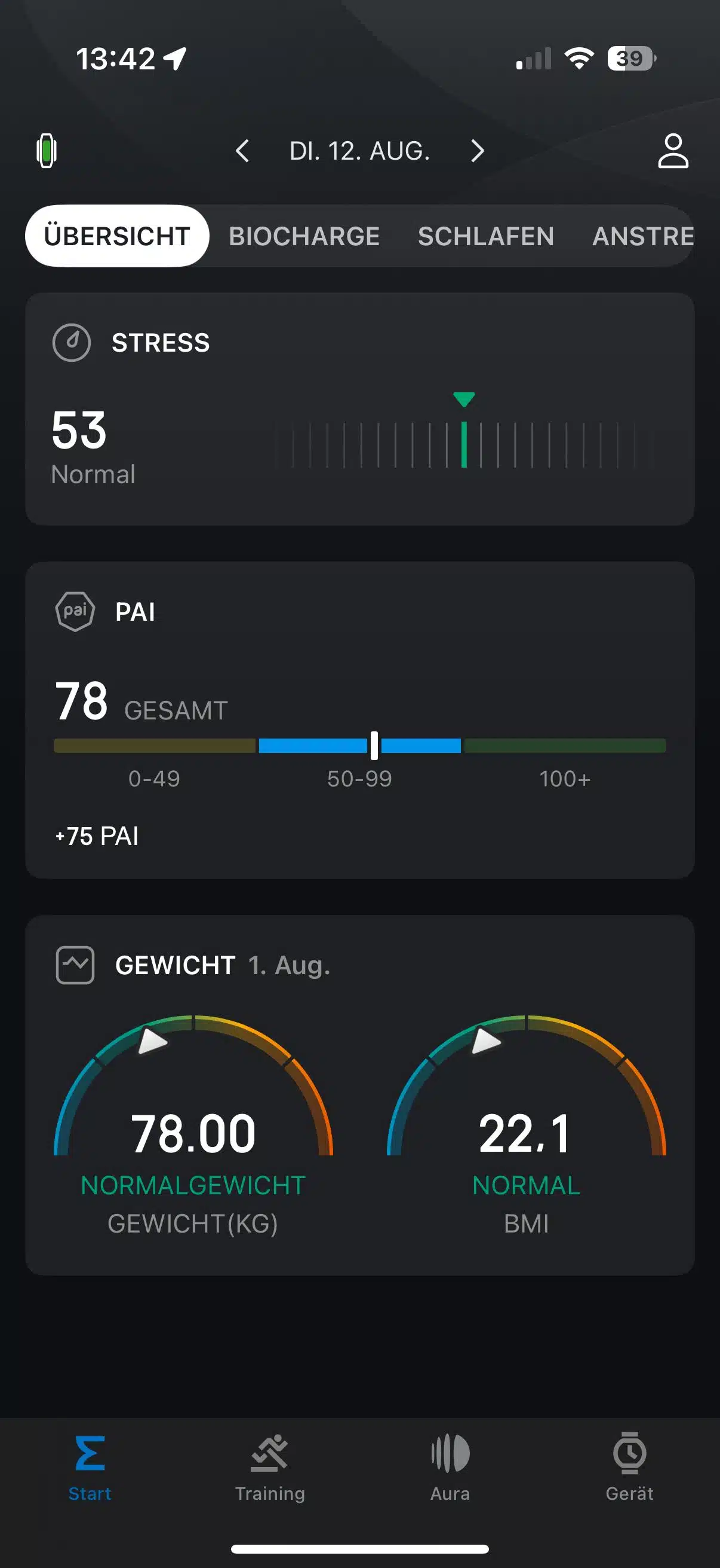 Herzfrequenz, SpO2, Schlaftracking, Stressanalyse – all das wird geboten. Besonders die neue Biocharge-Metrik zur Erholung und der Exertion Score zur Trainingsbelastung zeigen, dass Amazfit hier einiges an Know-how reingepackt hat. Die Auswertung in der Zepp-App ist sauber umgesetzt und recht verständlich auf den ersten Blick.