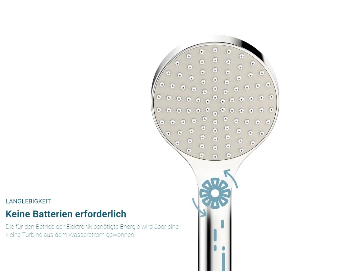 So sitzt im Inneren der Handbrause eine kleine Turbine, die durch den Wasserstrom in Bewegung gesetzt wird und somit genug Energie erzeugt, um alle Funktionen mit Strom zu versorgen.