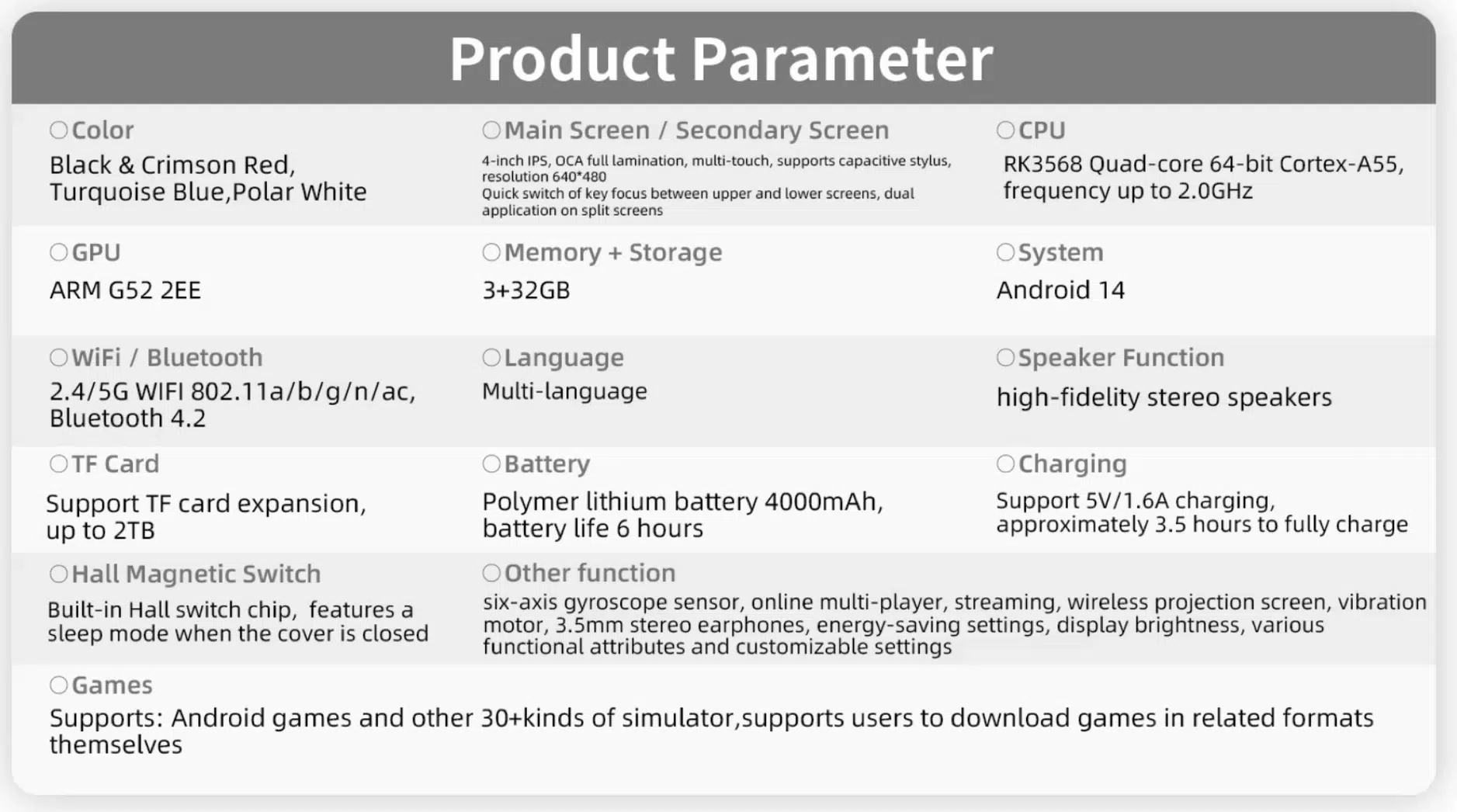 Anbernic RG DS – Dual-Screen-Retro-Handheld mit Android 14 Dual-Display 2×4″, Touchscreen unten, Rockchip RK3568, 3 GB RAM