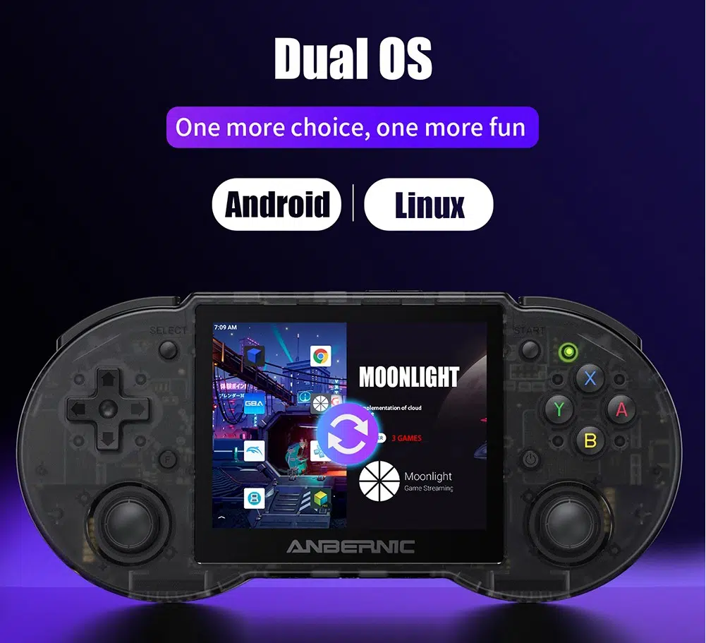Anbernic setzt auf ein duales, bootbares Betriebssystem. Auf dem internen 32 GB großen Speicher ist Android 11 vorinstalliert und zusätzlich wird noch eine 16 GB Speicherkarte mit einer einfacheren bootbaren Linux Oberfläche dazu gepackt.