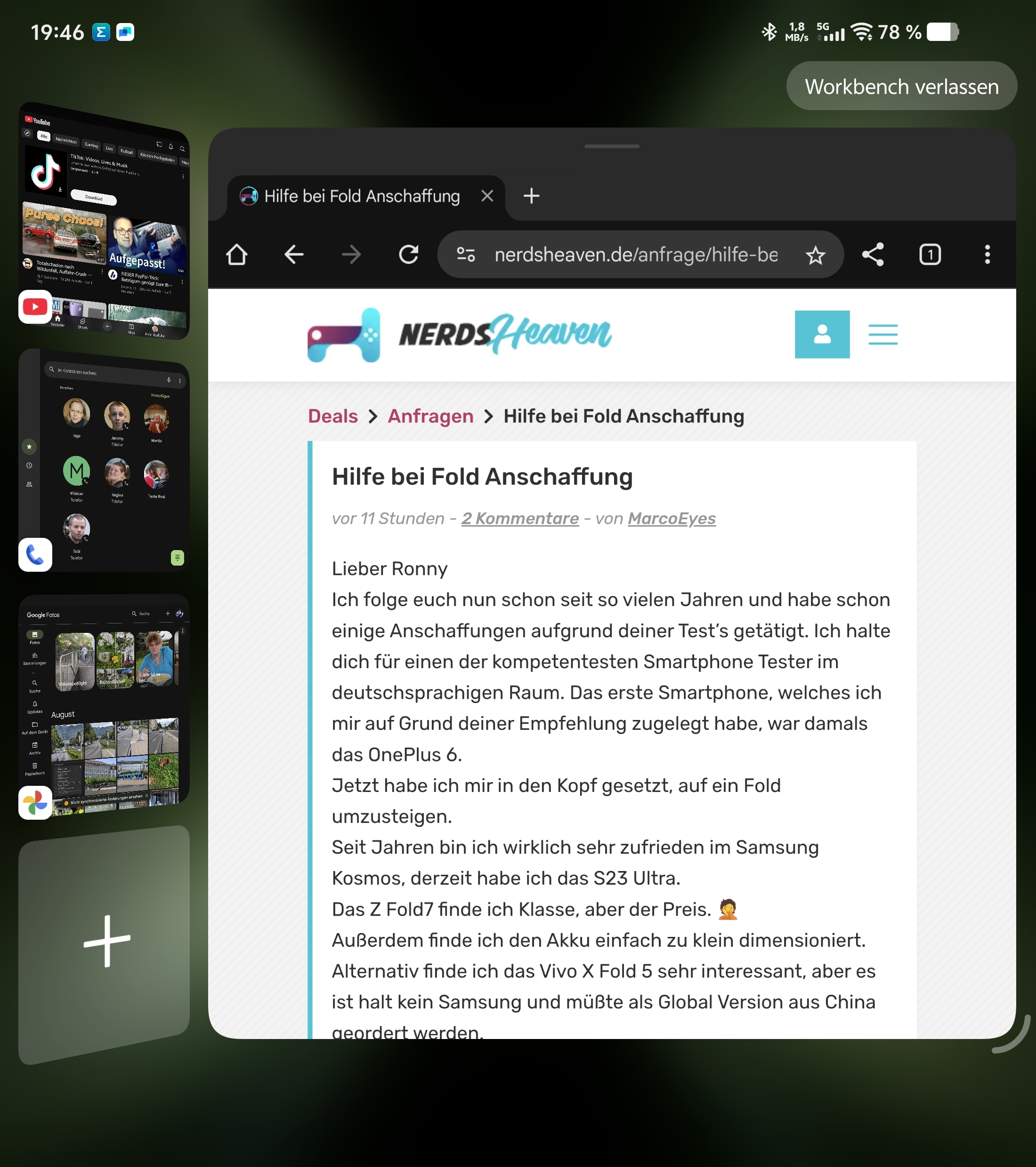 18.08.2025, 19:56Noch ein kurzer Nachtrag zum Vivo: Das Vivo bringt als einziges Smartphone nicht nur die Splitscreens und Floating Windows mit sondern den exklusiven Workbench. Das bedeutet Vorteile beim Multitasking durch gleichzeitig 5 offene Apps, zwischen denen man hin und her switchen kann, Daten übertragen, Videos parallel laufen lassen etc.