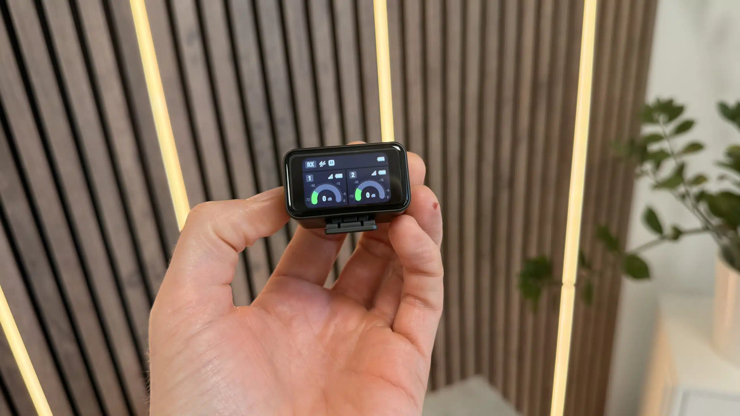 Spannend ist der integrierte Ansatz: Jeder Sender bringt 7 Stunden Onboard-Aufnahme mit, während Akku und Ladecase zusammen auf bis zu 15 Stunden Gesamtbetrieb kommen. Dazu kommt ein 1,47-Zoll-Touchscreen am Empfänger, der mehr kann als nur Pegel anzeigen. Einstellungen wie Noise Cancelling oder Stereo/Mono lassen sich direkt per Wischgeste steuern – angenehm modern, ohne App-Zwang.