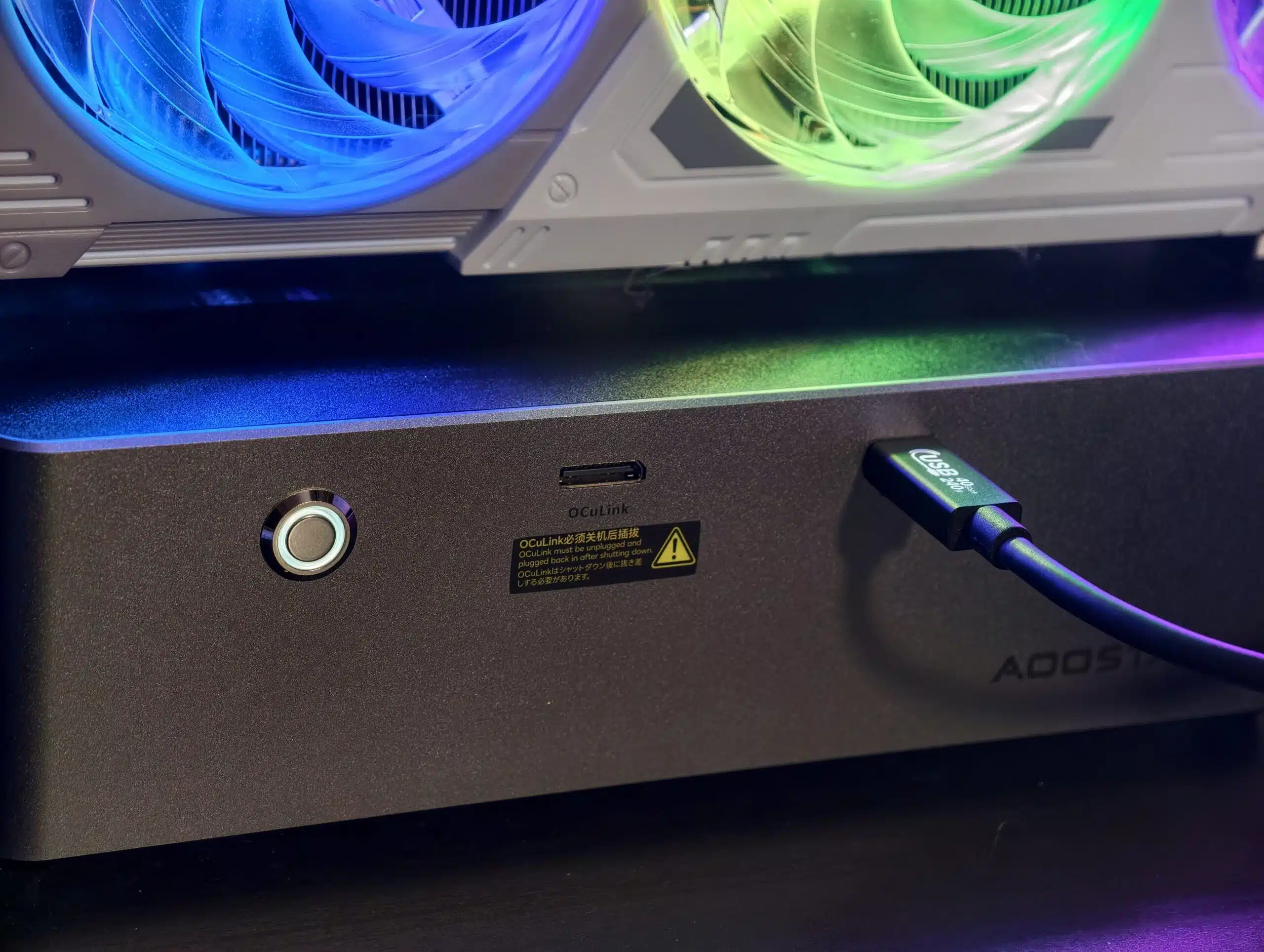 Die Verarbeitung gefällt mir sehr gut, gerade für LED-beleuchtete GPUs ist die offene Bauweise sau cool. Die Anschlüsse für Oculink und Thunderbolt 4 liegen auf der Vorderseite. Daneben ein runder Schalter, der keine Funktion hat. Ja das wird auch so beworben. Warum? Fragt bitte nicht mich. Ein kleiner Fakt, der mir aufgefallen ist: Ist kein Kabel angesteckt, also die GPU auch nicht in Betrieb, hört man dennoch einen Lüfter leise vor sich hinsurren. Hier hab ich das Netzkabel immer getrennt.