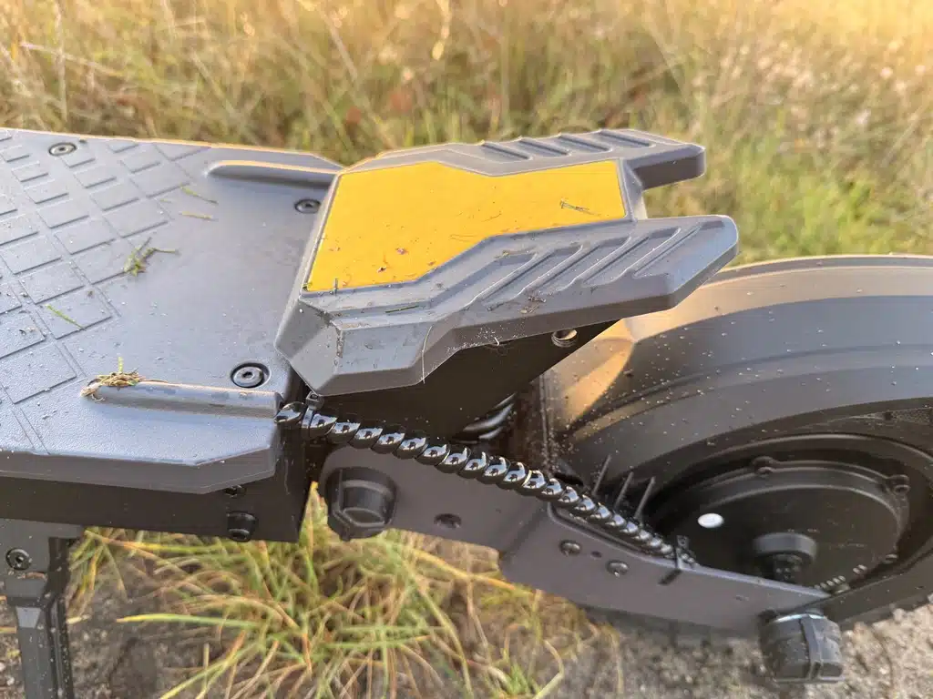 Im Heck arbeitet ein 500-Watt-Motor, der in der Spitze bis zu 930 Watt liefert und satte 29 Nm Drehmoment erzeugt. Damit sollen selbst Steigungen bis 20 Grad kein Thema sein. Apropos Heck, das Wheele Board fand ich besonders während der Fahrt angenehm, da ich warum auch immer mit angewinkeltem Fuß fahre und nach der Zeit sich dann doch schmerzen entwickeln. Dies wird hierdurch gefühlt vorgebeugt.