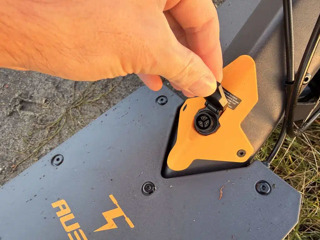 Der Akku mit 748,8 Wh Kapazität (48V/15,6Ah) bringt euch laut Hersteller bis zu 70 Kilometer weit, realistisch dürften es 50 bis 60 km sein, abhängig von Gewicht, Temperatur und Gasfuß. Geladen wird klassisch über Netzteil und rund 11 Stunden Ladezeit sind angesagt. Eine Schnellladefunktion fehlt, dafür gibt’s ordentlich Ausdauer.