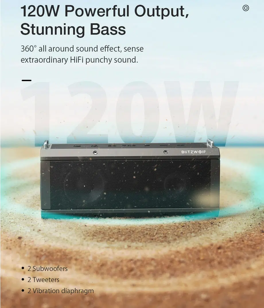 Der BlitzWolf BW-WA3 Pro kommt auf insgesamt vier Treiber. Zwei der Treiber sind Hochtöner mit einen Durchmesser von 52mm und zusätzlich sind an dem Lautsprecher noch zwei 78mm Bass Treiber verbaut. Zusätzlich hat man die Möglichkeit auf 3 Equalizer Modi (Vocal Mode, 3D Mode, Heavy Bass Mode) zurückzugreifen.