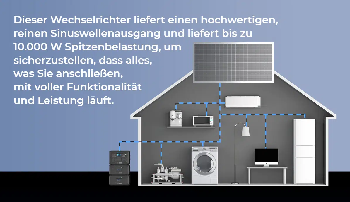 Die Ausgangsleistung beträgt 5000 Watt und in der Spitze können sogar kurzzeitig 10.000 Watt erreicht werden. Das reicht aus, um selbst mehrere, normale Haushaltsgeräte vom Smartphone über die Waschmaschine bis zum Kühlschrank zu versorgen. Selbst die Klimaanlage dürfte damit versorgt werden können. Wie lange die Energie reicht, hängt natürlich von der Gesamtkapazität ab.