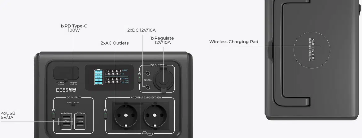 BLUETTI EB55 – kleines Notstromaggregat mit 537Wh induktive Ladefläche, 12 Geräte gleichzeitig laden