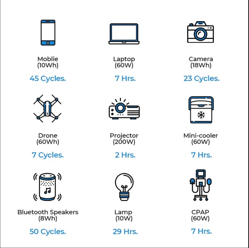 Eigentlich alles was einen Stecker hat. Letztendlich geht es ja auch nicht nur um das Beladen, sondern natürlich auch nutzen von Geräten. Mit der 300W Ausgangsleistung könnte ich auch eine 200 Watt TV für ~2 Stunden betreiben. Oder ein Notebook für 6-7 Stunden nutzen/beladen. Anhand des Screenshots seht hier noch weitere Beispiele oder die Anzahl der Ladezyklen, die durchgeführt werden können.