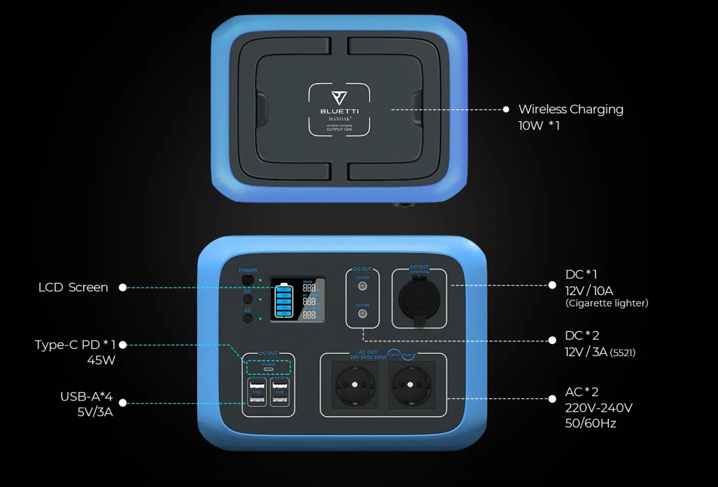 Mit 4x USB-A Ports und jeweils 5V/3A also 15 Watt, einem USB-Typ-C Power Delivery Port für bis zu 45 Watt, 2x EU-Schucko Steckdosen mit maximal 300W Ausgangsleistung, sowie zwei weiteren Rundsteckern (5521) mit 12V/3A (48W) und einer KFZ Steckdose mit 12V/10A (120W) ist für alles Wichtige gesorgt. Auf der Oberseite liegt sogar eine induktive Ladefläche mit 10 Watt vor, um beispielsweise ein Smartphone kabellos aufzuladen.