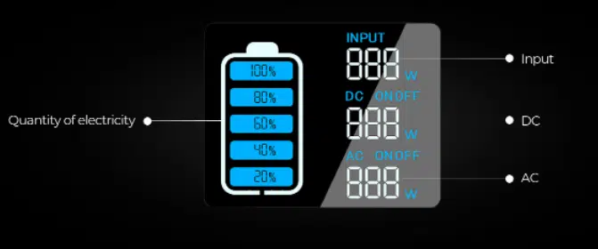 Damit man auch die Kapazitäten des Akkus oder den aktuellen Verbrauch gut ablesen kann, ist ein kleines LC-Display verbaut worden. Dies zeigt rudimentäre Informationen an. Mittels daneben liegenden Bedienknöpfen lassen sich bestimmte Quellen auch aktivieren bzw deaktivieren.