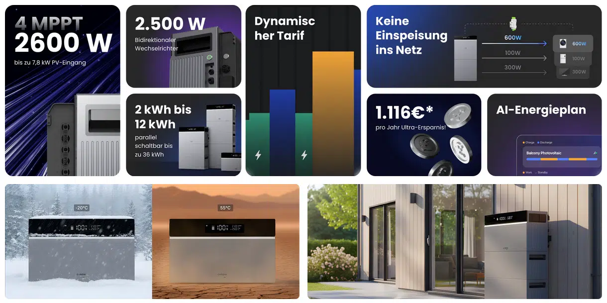 Der Conow CBE 2000 Pro ist ein 2,5-kW-All-in-One-Energiesystem, das Wechselrichter, Batteriespeicher und Steuerung in einer Einheit vereint. Es koordiniert PV-Module, Mikrowechselrichter und den Haushalt direkt. Das KI-basierte Energiemanagement optimiert Eigenverbrauch und Effizienz in Echtzeit, während die Integration ins Tuya-Smart-Home-System eine zentrale Steuerung aller verbundenen Geräte ermöglicht.