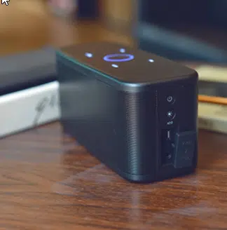 An der linken Seite ist der Powerbutton und eine Multifunktionstaste (TWS Pairing und Beleuchtungsmodi) untergebracht. Unter einer Gummikappe findet man die Eingänge: AUX, Micro-USB und ein SD-Karten Slot. Zusätzlich noch eine kleine LED, die anzeigt, ob geladen wird oder nicht. Die Doss SoundBox Plus unterstützt TWS (True Wireless Stereo), was nicht anderes heißt, als dass man 2 Soundboxen koppeln kann und auf die weise echtes Stereo genießen kann.