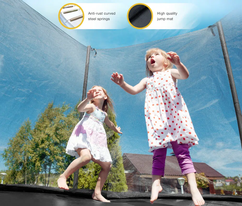 Die Stahlrahmenrohre sind 1,6mm stark, um so das ganze Gerüst und das Springen aushalten zu können. Die Stangen am Netz sind zusätzlich mit Schaumstoff ummantelt, um sich nicht daran verletzten zu können. Das Sprungtuch besteht aus hochfesten und verschleißfesten PP-Material und ist durch die 72 verstärkten Federn (anti-Rost) extrem belastbar. Bis zu 200kg hält das Trampolin stand. Zudem hat es den ASTM-Test (F381-16) für UV-Schutz bestanden