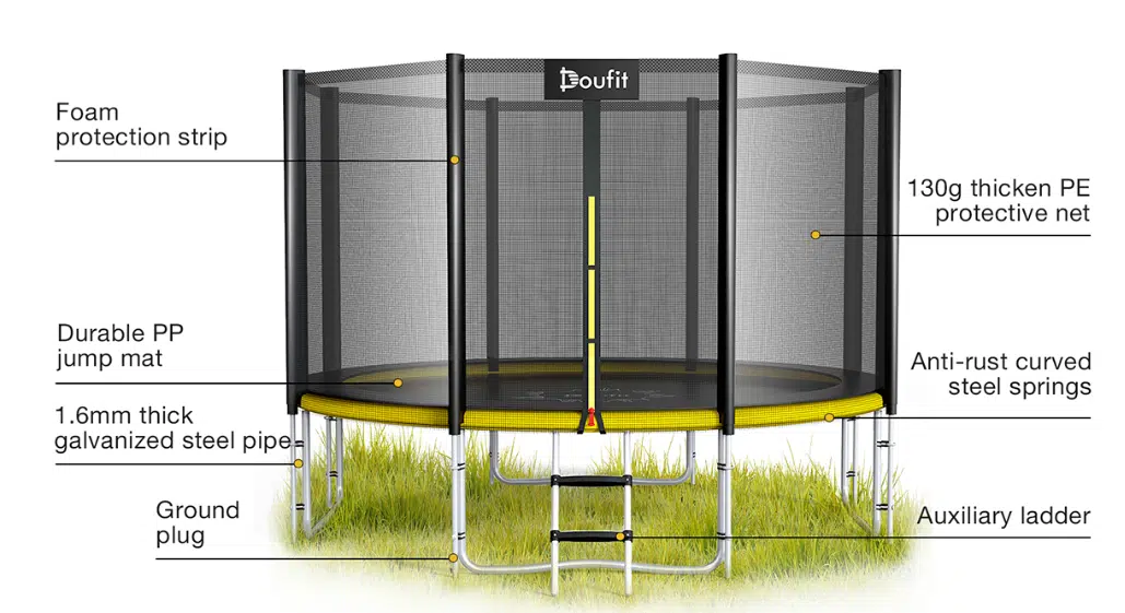 Das Doufit Trampolin liest sich in jeglicher Hinsicht einfach gut. Alles ist dabei, was man braucht und für zusätzliche Sicherheit, durch mehr Federn und extra bodentiefe Stangen, ist auch gesorgt.