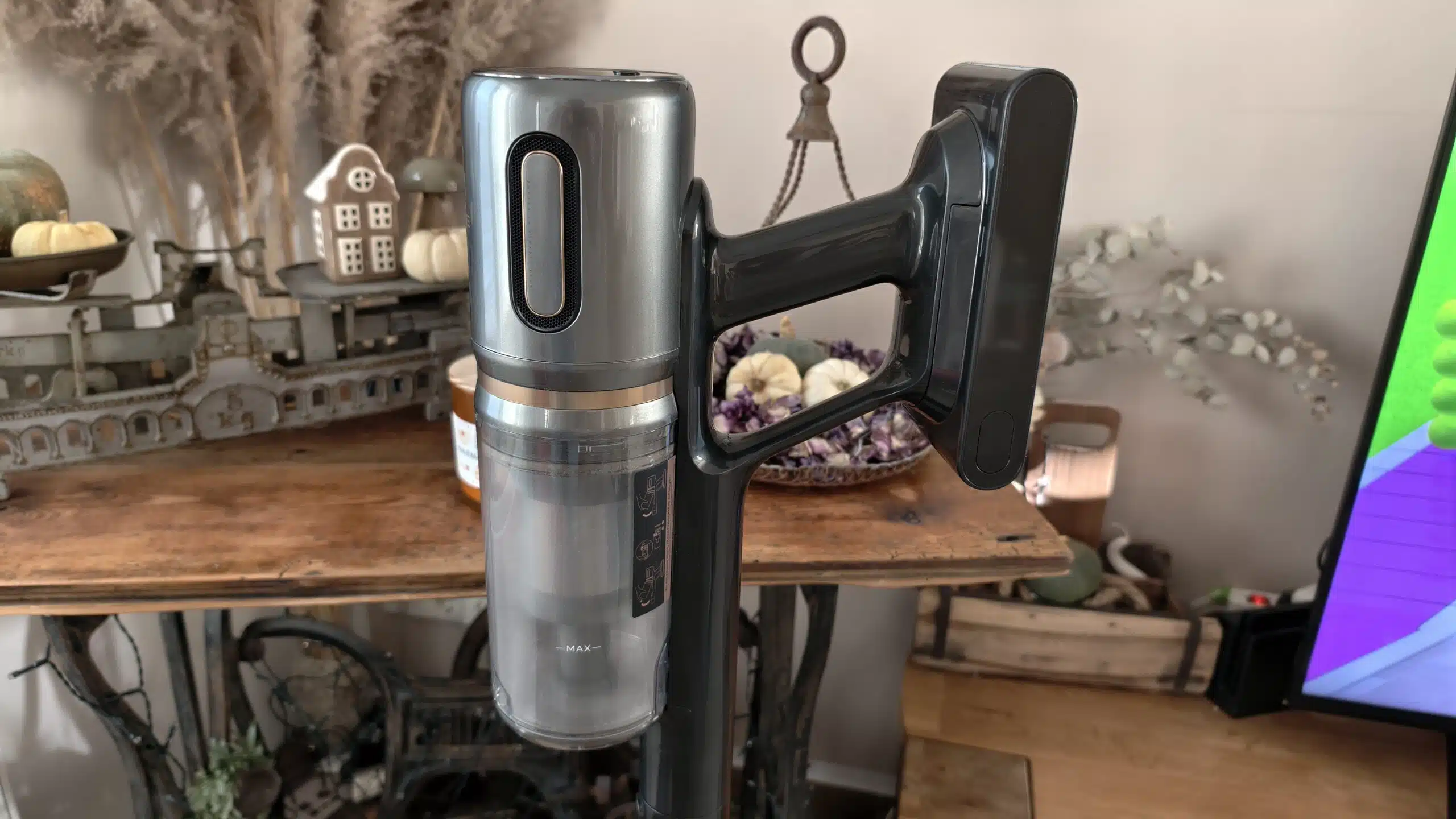 Der Staubbehälter fasst 0,5 Liter, das Gesamtgewicht des Handteils liegt bei 1,6 Kilogramm. Verarbeitung und Materialqualität wirken hochwertig, alle beweglichen Teile rasten präzise ein.