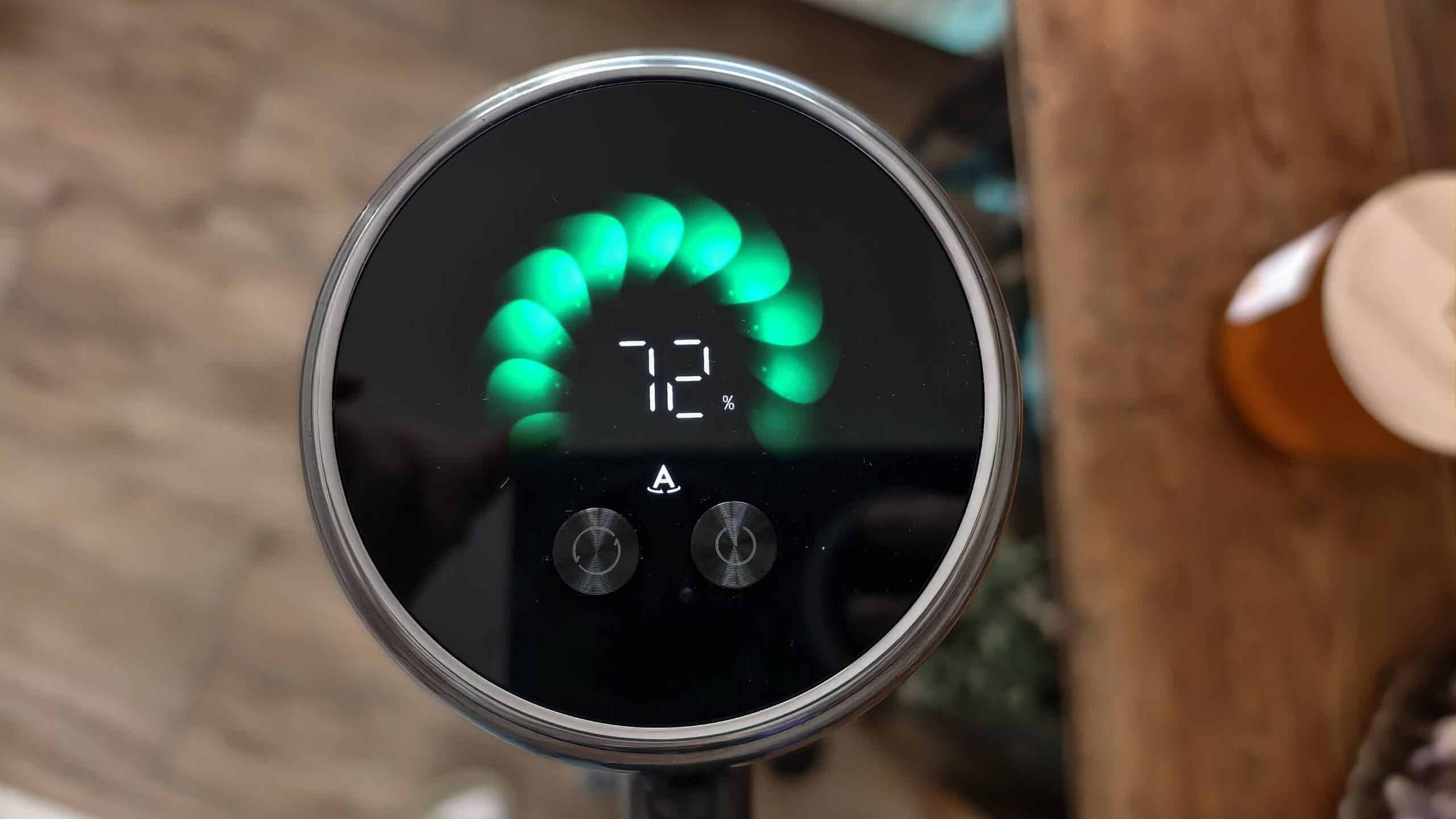 Die Handhabung ist unkompliziert. Das Display auf der Oberseite zeigt Akkustand, Betriebsmodus und Verschmutzungsgrad über ein Farbsystem (Grün, Orange, Rot). Der Sauger passt im Automatikmodus die Leistung selbstständig an die Schmutzmenge an.