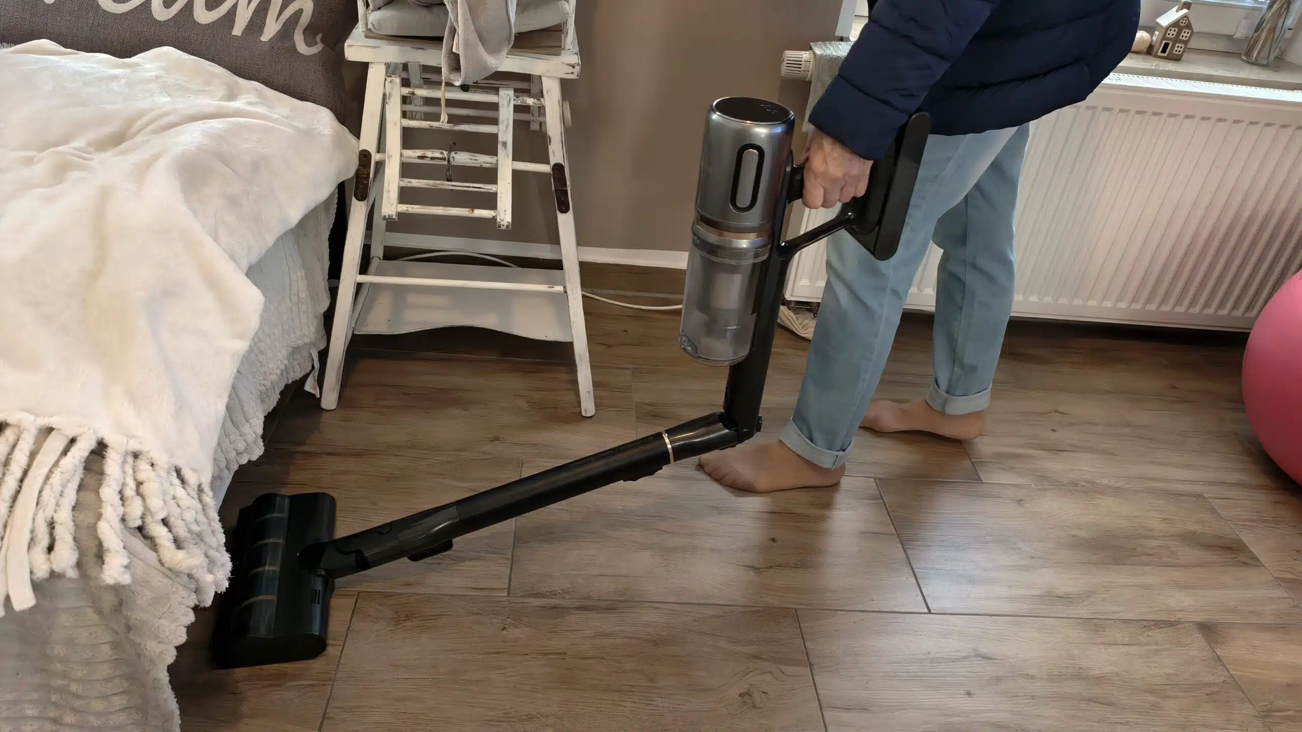 Ein Highlight ist das Knicksystem, mit dem sich das Rohr anwinkeln lässt, um unter Sofas oder Tischen zu saugen. Das Gerät steht in einer massiven Basisstation, die zugleich als Ladesockel dient – eine Wandmontage ist nicht nötig.