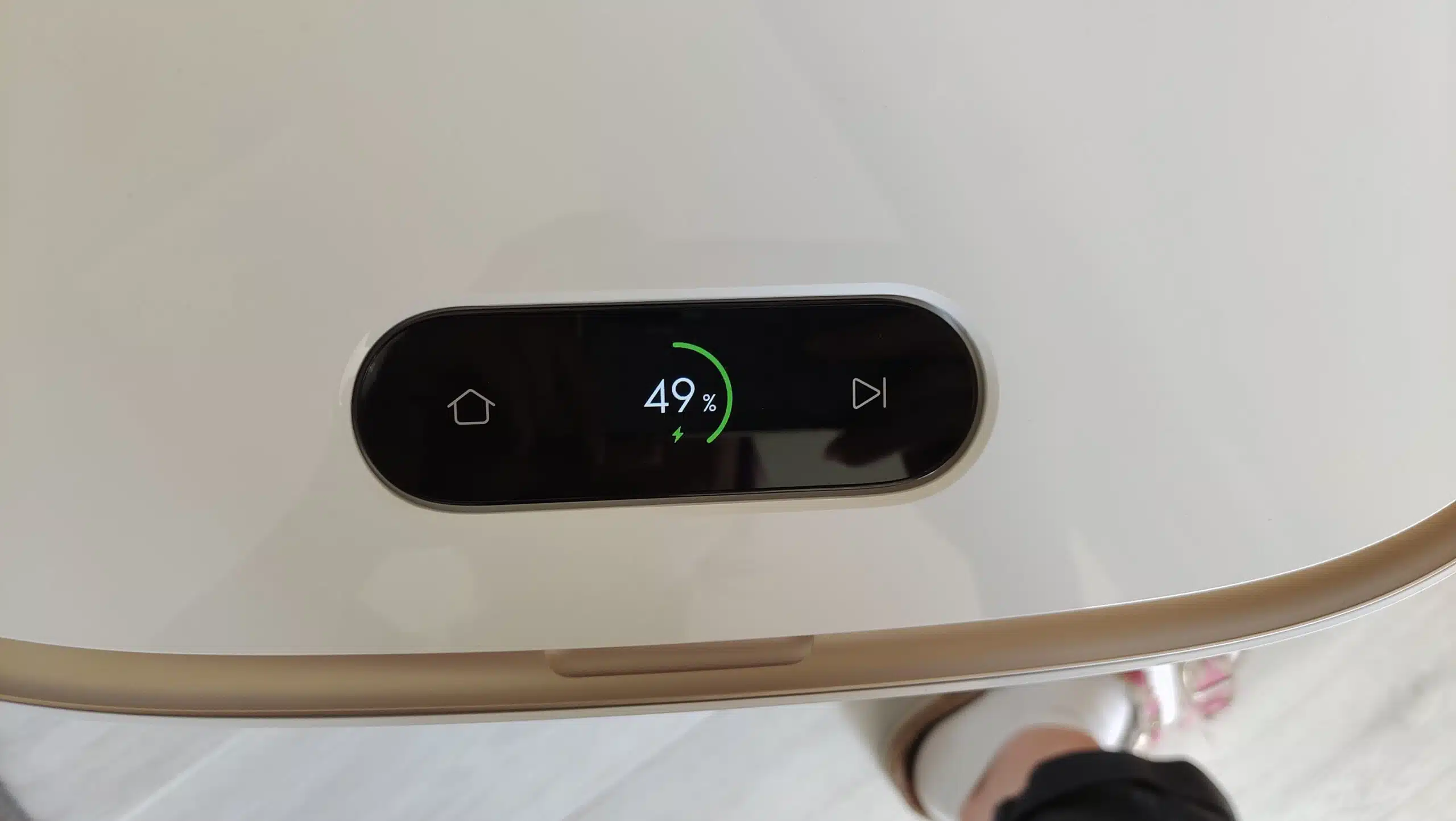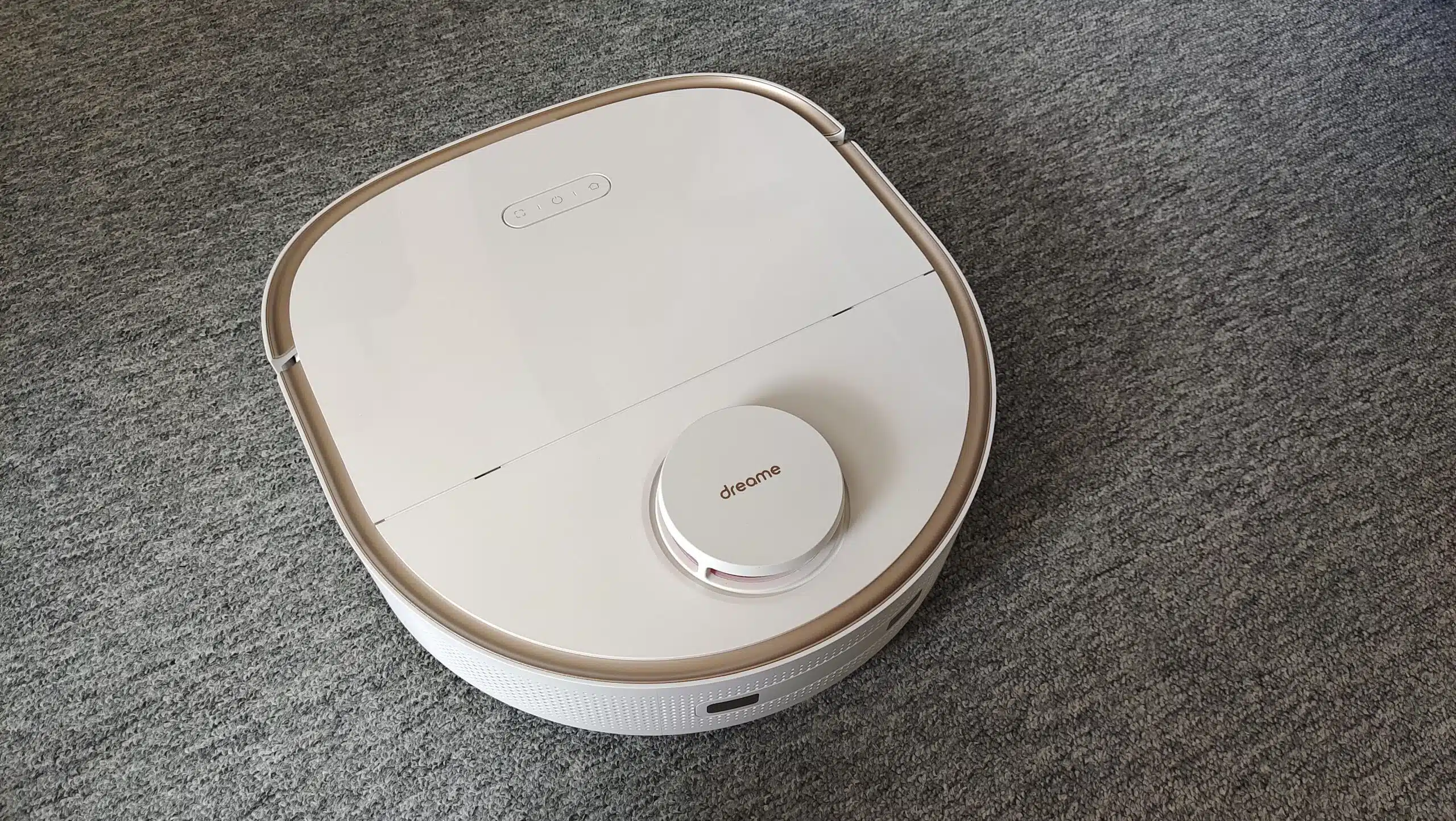Nicht rund, aber auch nicht eckig, eher so eine leichte D-Form. Daher ist der Anblick erstmal ungewohnt. Man gewöhnt sich aber schnell daran, wenn man bemerkt, wie gut er doch verarbeitet ist. Der Dreame W10 Pro ist mit einem schicken goldenen Rand verziert und hat obendrauf seinen Laser Turm zu sitzen. Dieser sitzt nicht mittig, sondern weiter hinten, so befinden sich dann weiter vorne die Bedienknöpfe.