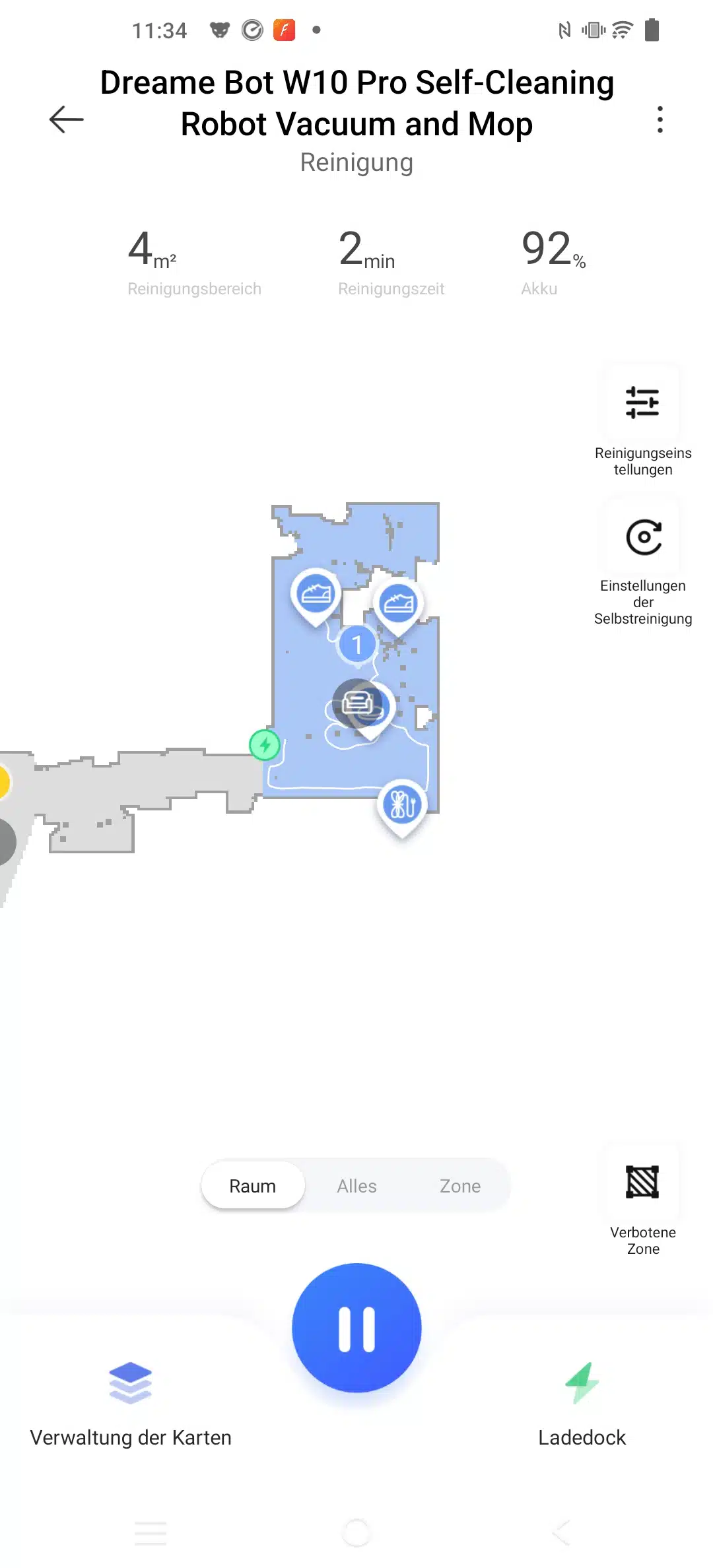 Eingestellt habe ich, dass er nach 5qm zurück in seine Station fährt, um die Wischpadds zu reinigen und die Saugkraft auf die mittlere Stufe. Vor der Fahrt spült er die Padds einmal ordentlich durch, bevor es losgeht. So fährt er erstmal den Rand ab und siehe da, er fährt zurück, reinigt sich und setzt die Reinigung fort. Das klappt also schonmal wunderbar.