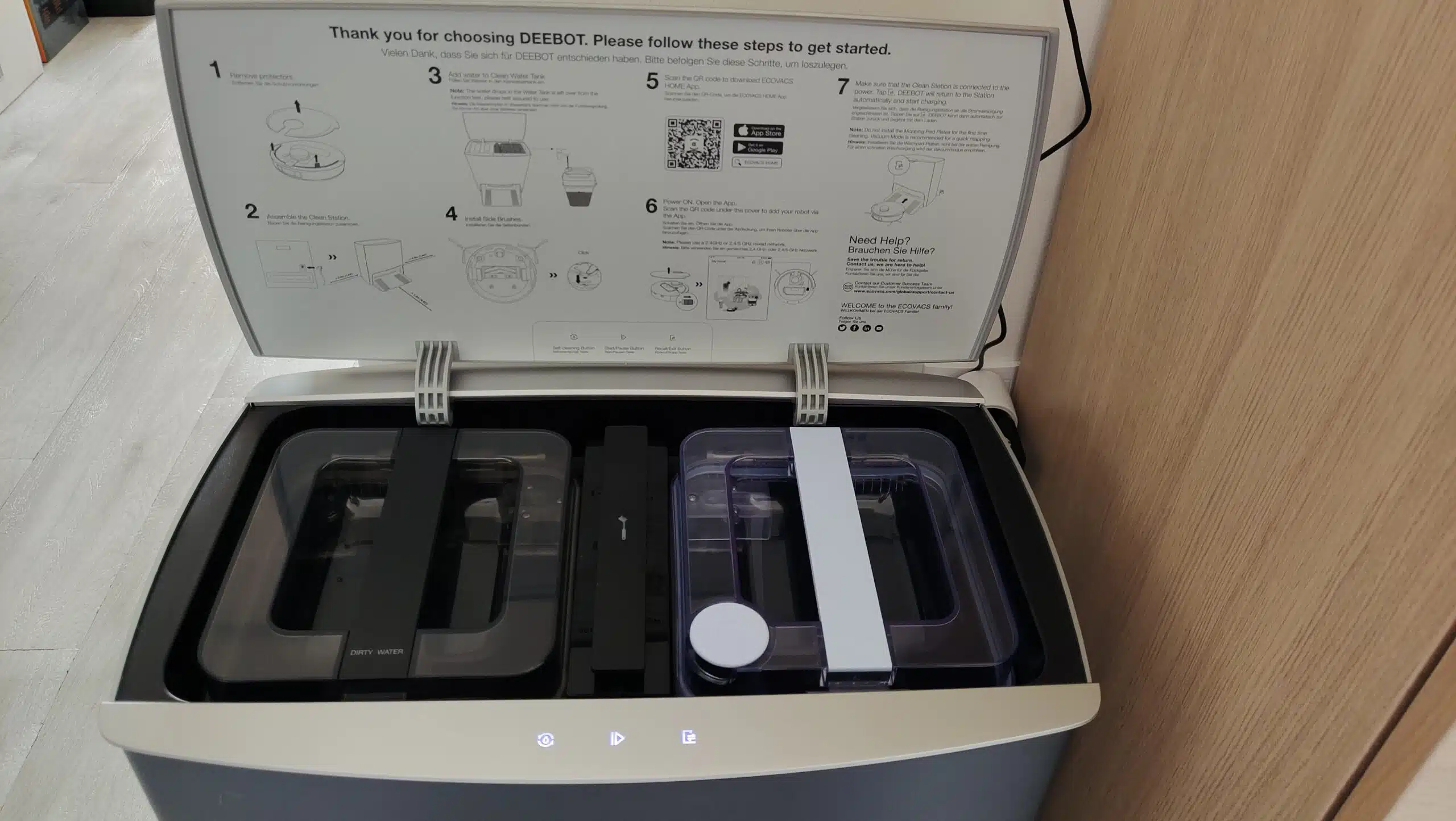 Wischmopps ran, Wassertank auffüllen und Wasserdurchflussrate einstellen, schon gehts los. Dachtet ihr, nein, zunächst reinigt die Station die Mopps direkt vorm Wischvorgang einmal durch und befüllt den Wassertank.