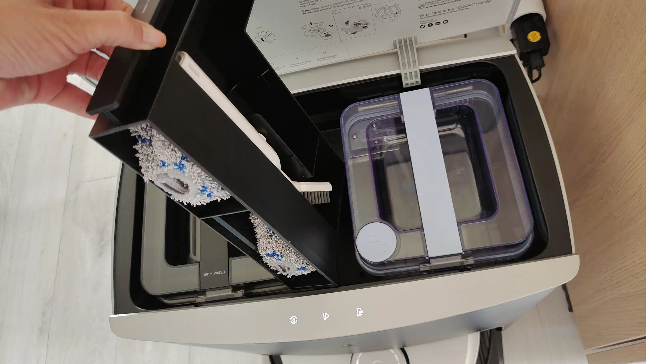Im Übrigen verfügt die Reinigungststation über einen Luftstrom der den Mop trocknen soll. Dieser Vorgang dauert aber mehrere Stunden und war nur bedingt Zweck erfüllend. Das Abnehmen und abseits lagern der Mopse, macht dahingegen mehr Sinn.