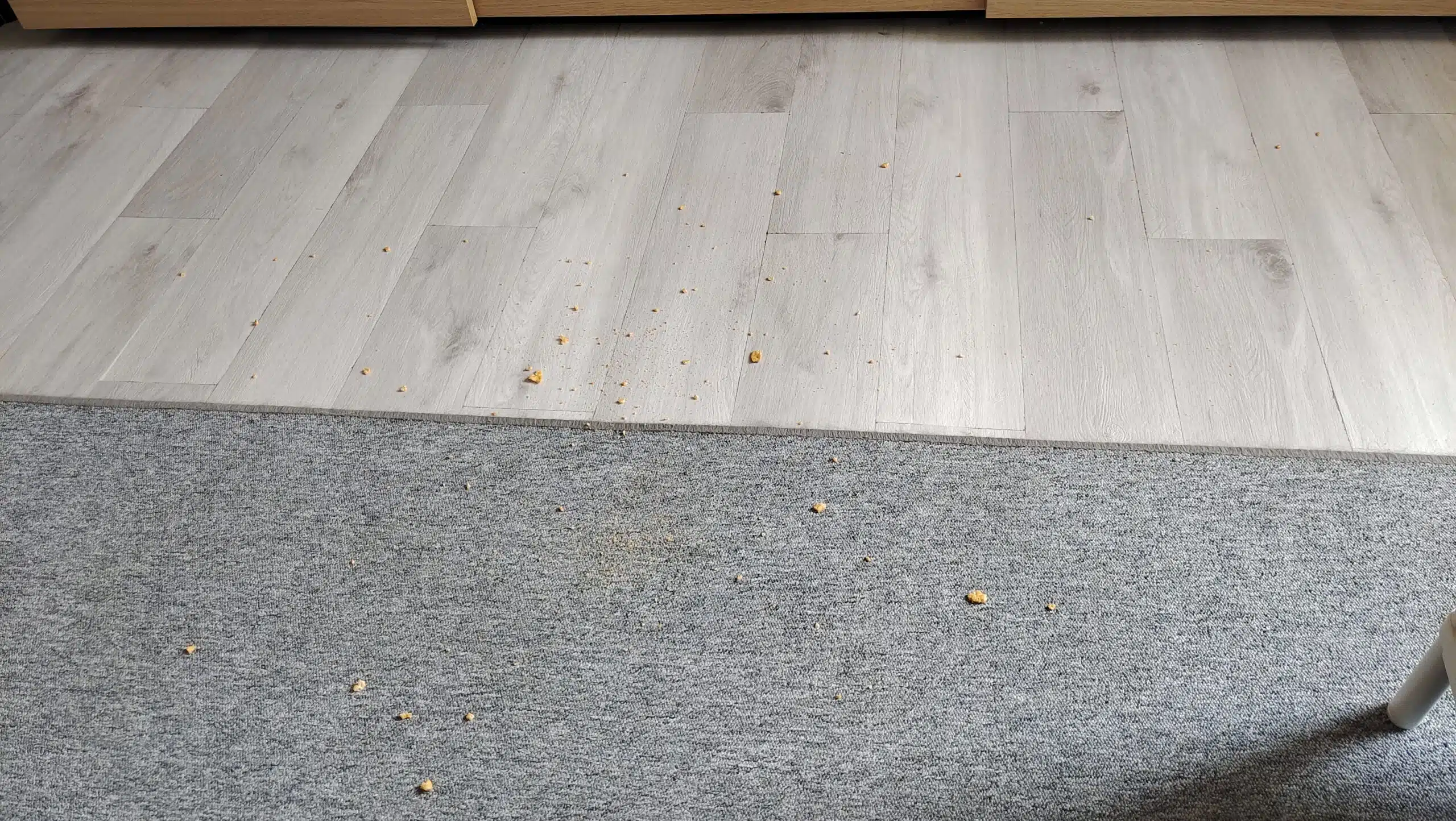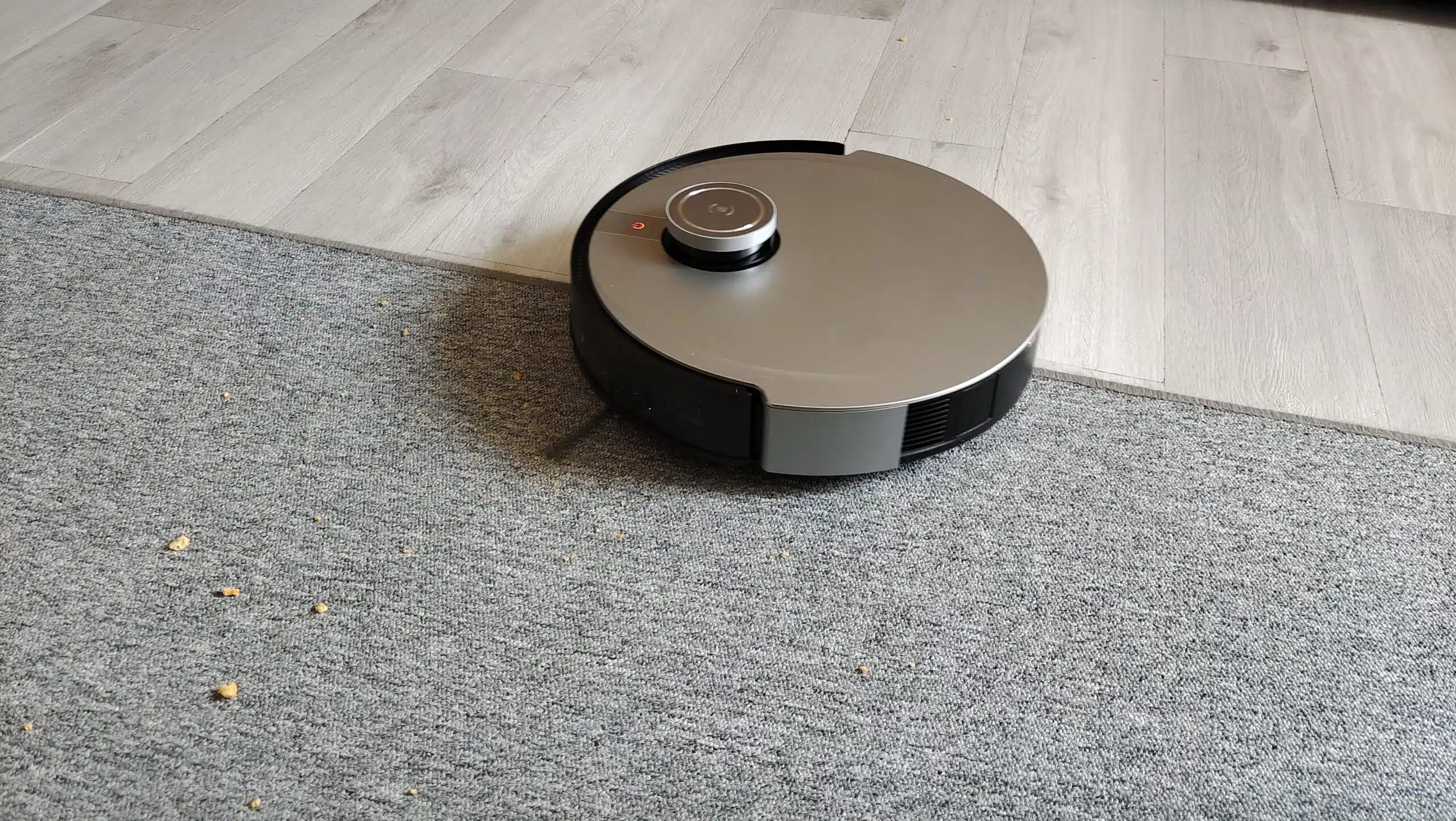 Also gleich mal aktiviert und Chips Krümmel auf dem Boden verteilt. Und schauen, was er mit seinem 5000pa Saugmotor leistet.