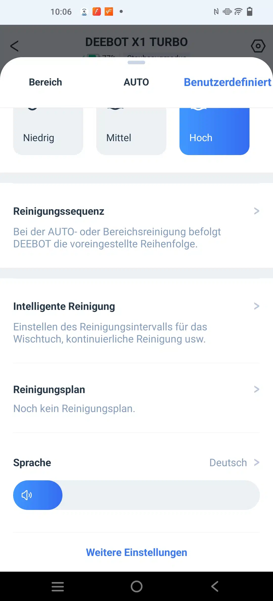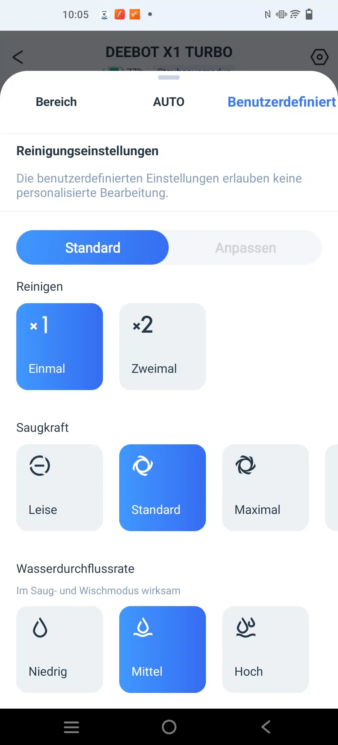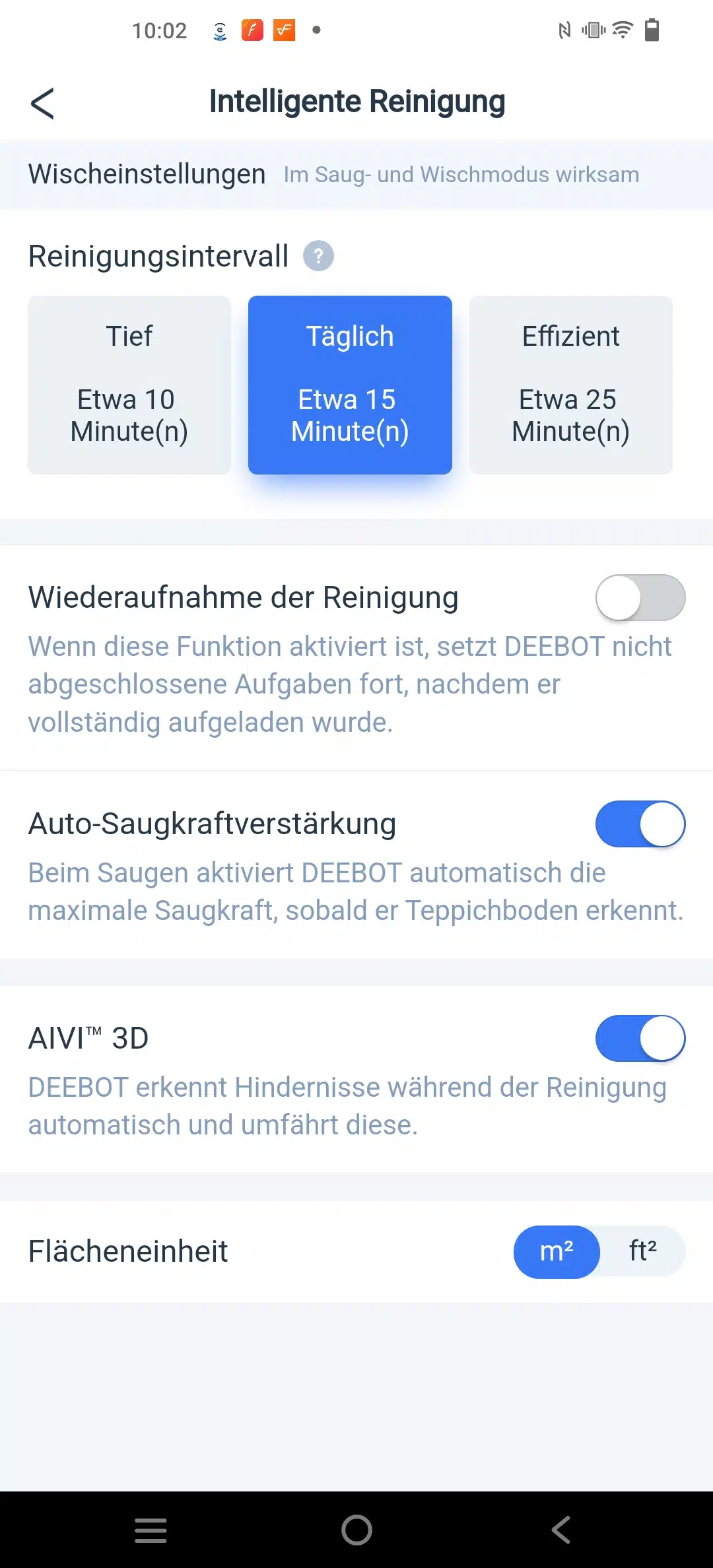 Ansonsten hat man die alt bekannten Einstellungen, Saugkraft in 4 verschiedenen Stufen, die Wasserdurchflussrate in 3 Stufen und wie intensiv er fahren soll.