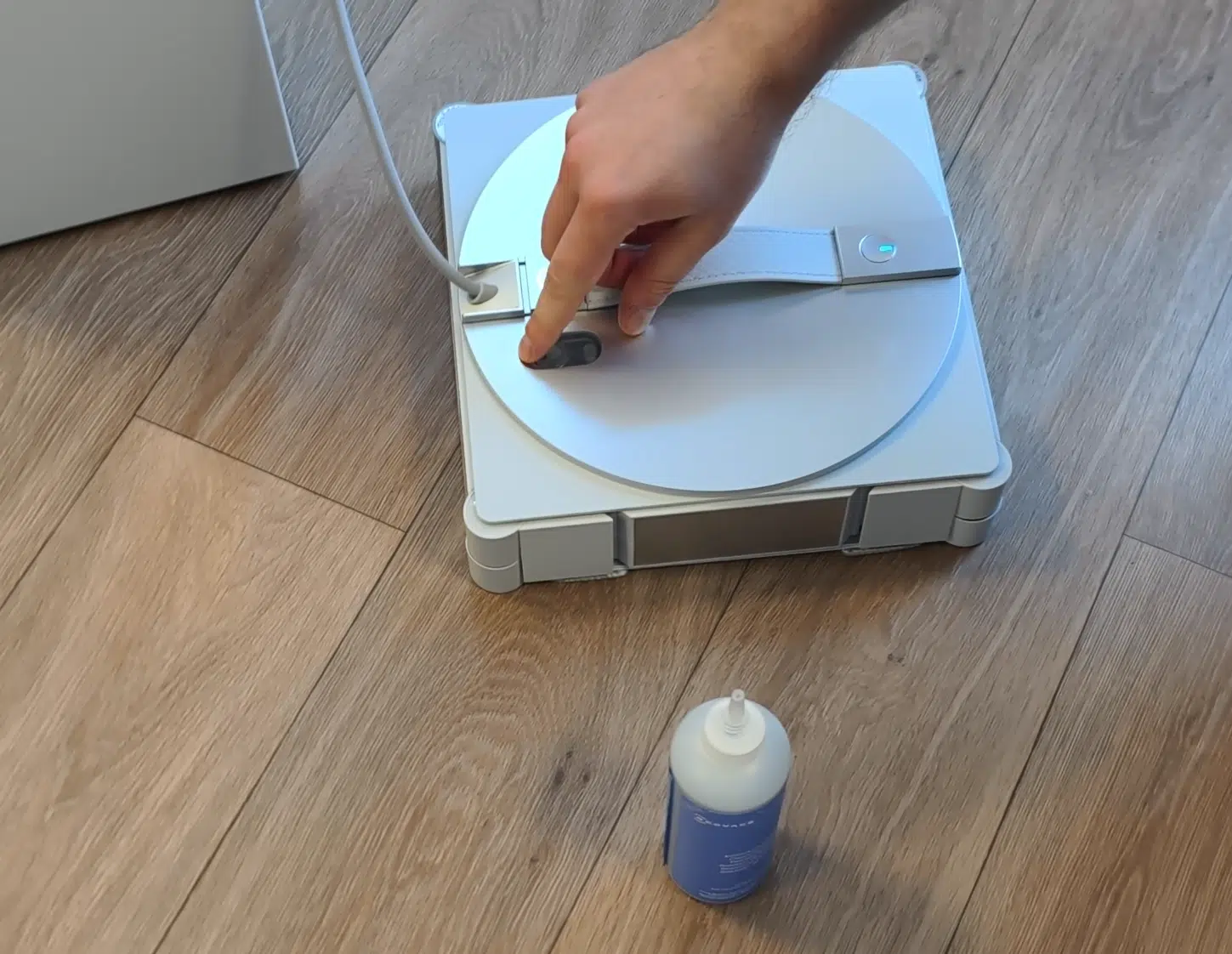 Das eigentliche Highlight sitzt im Dock. Der WINBOT W3 OMNI verfügt über eine integrierte Waschstation für die Wischtücher. Nach dem Einsatz wird der Roboter einfach von dem neu designten Wischpad mit starrem Plastikrahmen getrennt. Diesen setzt man in die Reinigungseinheit ein und per Knopfdruck startet die 60-sekündige Reinigung.