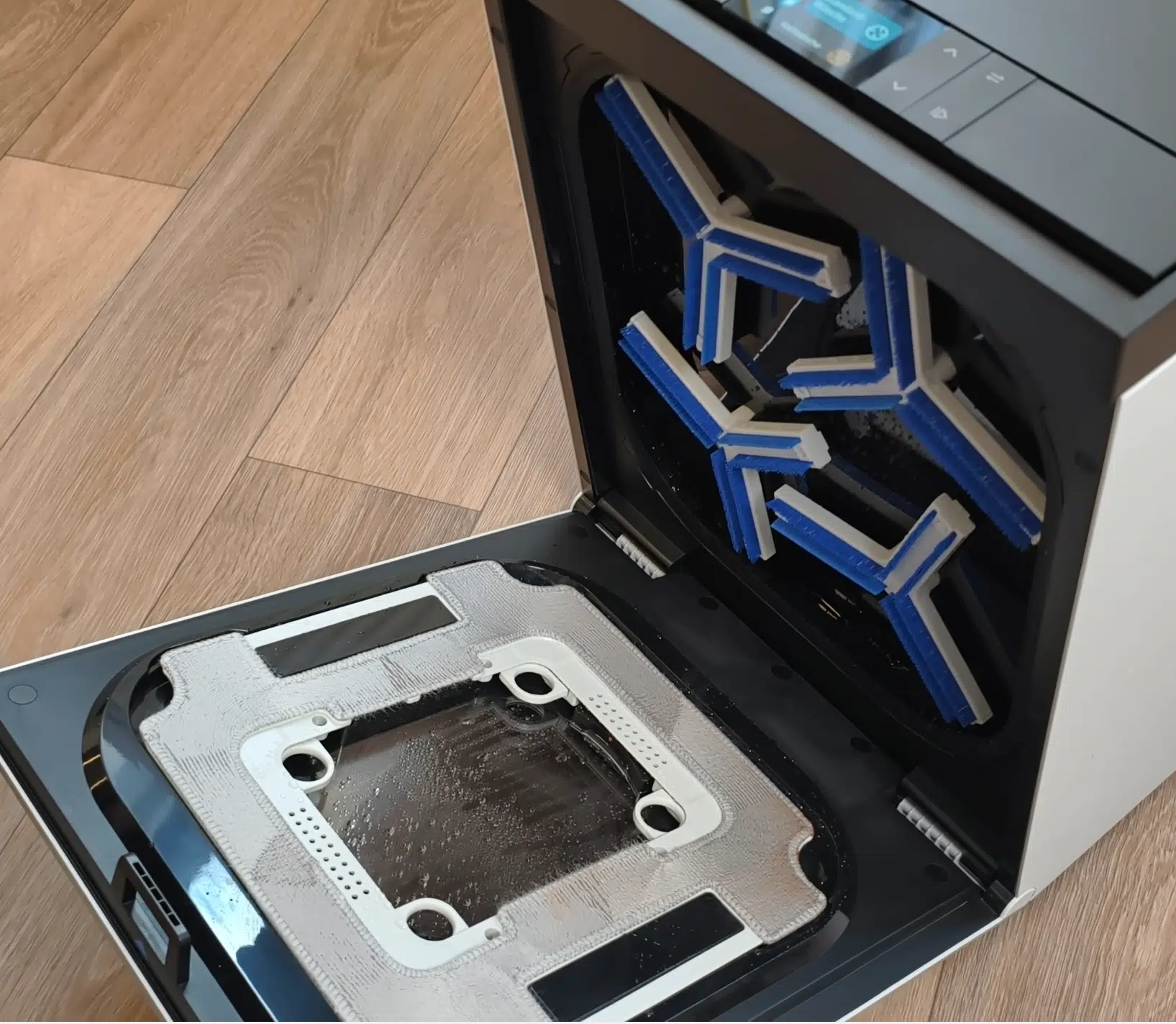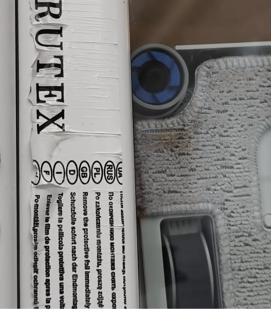 Eine auch schon bekannte Besonderheit ist die TruEdge Edge Cleaning-Technologie. Dabei senkt sich ein runder, spezieller Silikonwischer gezielt in den Ecken ab und fährt damit auch die Kanten, um sie zu reinigen, entlang. Ist der Bereich beendet, hebt er sich danach wieder an, um Verschmutzungen nicht zu verteilen. Die blau markierten Silikon-Pads mit einem kleinen Druckpunkt, der aus Stoff besteht, muss man aber manuell reinigen.