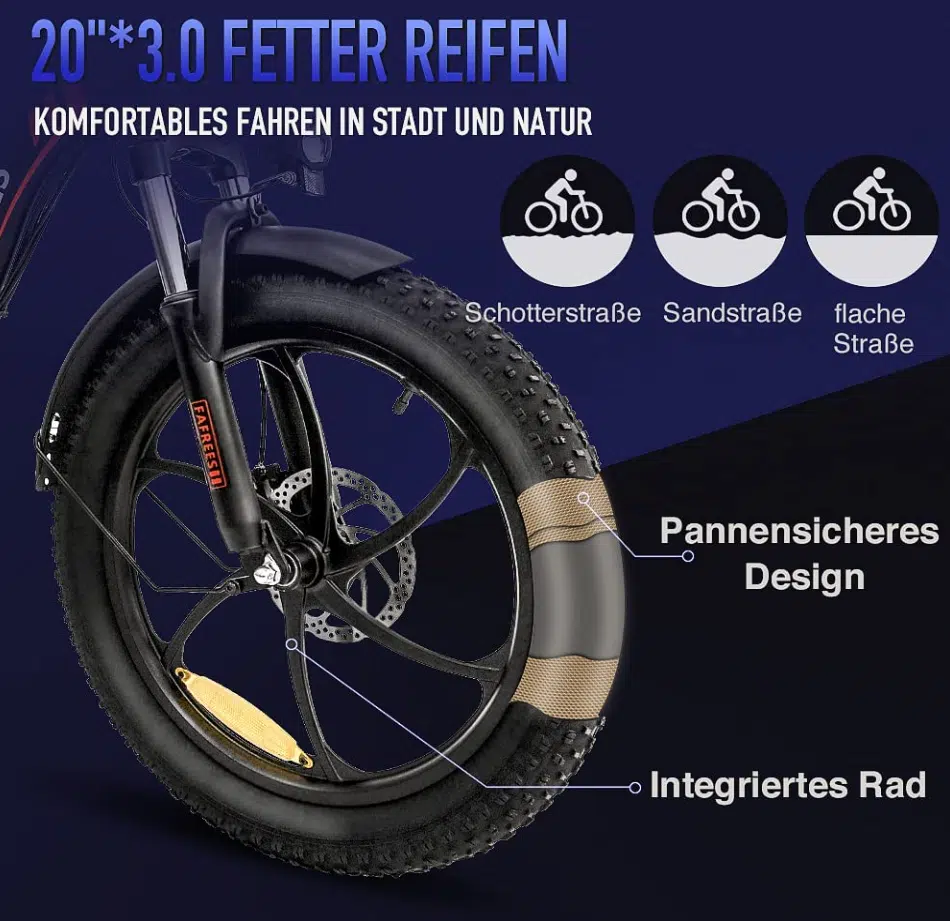 Die Reifen sind 20 Zoll groß und etwas breiter als normale Reifen. Was viele Vorteile hat, den man kann so nicht nur auf normalen Asphalt fahren, sondern auch einfach mal am Strand durch Sand fahren, ohne direkt umzukippen. 😅 Dementsprechend auch prima für Berg und Talfahrten geeignet, gerade durch die zusätzliche Federung vorne. Zudem soll der Mantel aus einem sogenannten Anti-Pannen-Material hergestellt sein, sodass man nicht direkt bei jeder Kleinigkeit einen Platten bekommt.