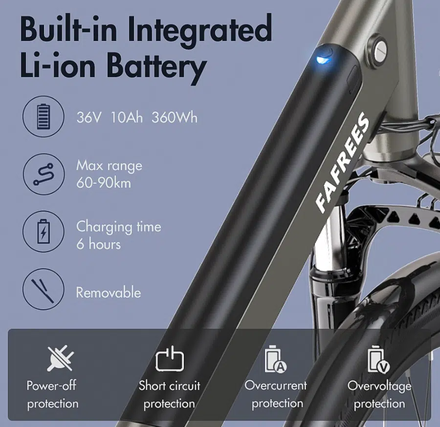 Für die Energieversorgung ist ein 10 Ah starker Akku verantwortlich (36V, 360 Wh). Dieser befindet sich im Rahmen und kann zum Aufladen abgenommen werden. Dabei kann eine vollständige Akkuladung mit dem beiliegenden Netzteil bis zu 6 Stunden in Anspruch nehmen. Die Reichweite wird vom Hersteller, je nach Fahrmodus, mit 60 bis 90 km angegeben.