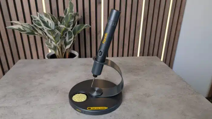 Ein Highlight für die Sicherheit und den Akkuverbrauch ist die intelligente Schwerkrafterkennung. Wenn ihr den Lötkolben für 15 Sekunden zur Seite legt, schaltet er automatisch in den Ruhemodus, so spart das Gerät auch wieder Akku. Sobald ihr ihn wieder in die Hand nehmt, erkennt das Gerät die Bewegung und heizt sofort wieder auf die Zieltemperatur hoch.