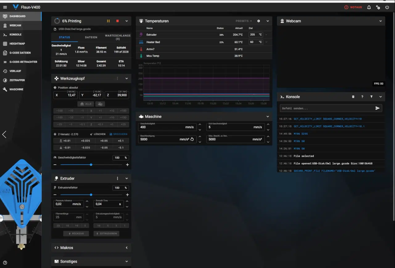 Das Klipper basierende Speeder Pad ist grundsätzlich einfach aufgebaut und Plug & Play fertig. Mittels WLAN Anbindung kann ich im Browser am Handy oder dem PC Einstellungen vornehmen oder den Drucker im gesamten steuern und stoppen. So kann ich auch eine Webcam anklemmen sofern vorhanden.