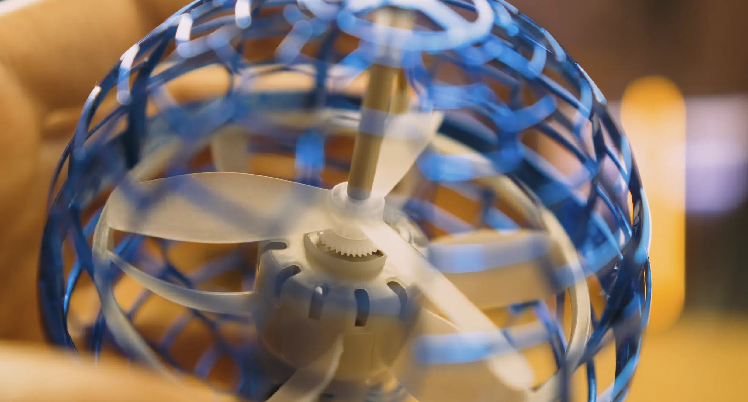Die Bedienung ist simpel: anschalten, kurz schütteln, und der Motor startet. Die LEDs im Inneren erzeugen dabei ein kleines Lichtmuster, das die Flugbewegung optisch unterstreicht.