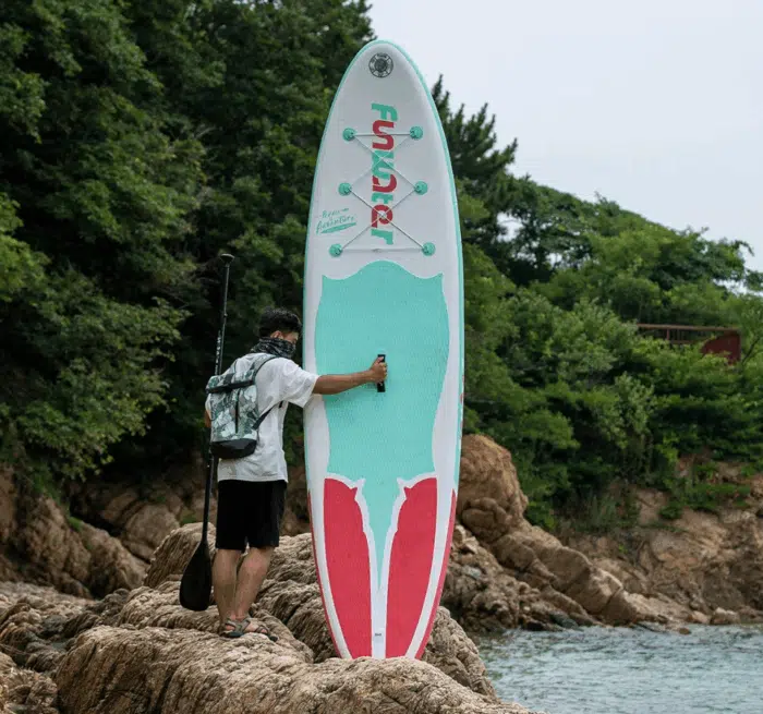 Der Hersteller Spasswasser hat ein SUP mit allem an Zubehör, was man braucht. Das Board selber, was aufblasbar ist und so gut in einer Tasche verstaubar ist (auch dabei), dementsprechend besitzt es natürlich ein Ventil zum befüllen und entleeren der Luft. Um es aufzublasen, zu können, wird eine Luftpumpe mitgeliefert. Am Board selbst befindet sich eine Handschlaufe, um es besser zum Wasser tragen zu können. Auf der Unterseite des Boards werden dann die Flossen befestigt, die für einen besseren Halt im Wasser sorgen.