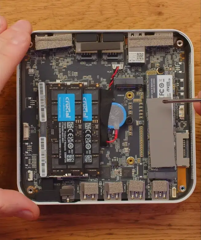 Damit man sich nicht mehr Arbeit als benötigt macht, sollte man die 2 Metallplatten mit den Antennenkabeln auf der Oberseite mit den Antennen abschrauben. Danach hat man Zugriff auf die 2 TB große 2280 NVMe SSD, darunter auf die WLAN/Bluetooth Karte, links davon einen freien 2230er SSD M.2 Slot zum Erweitern und wiederum links davon die beiden belegten RAM Steckplätze