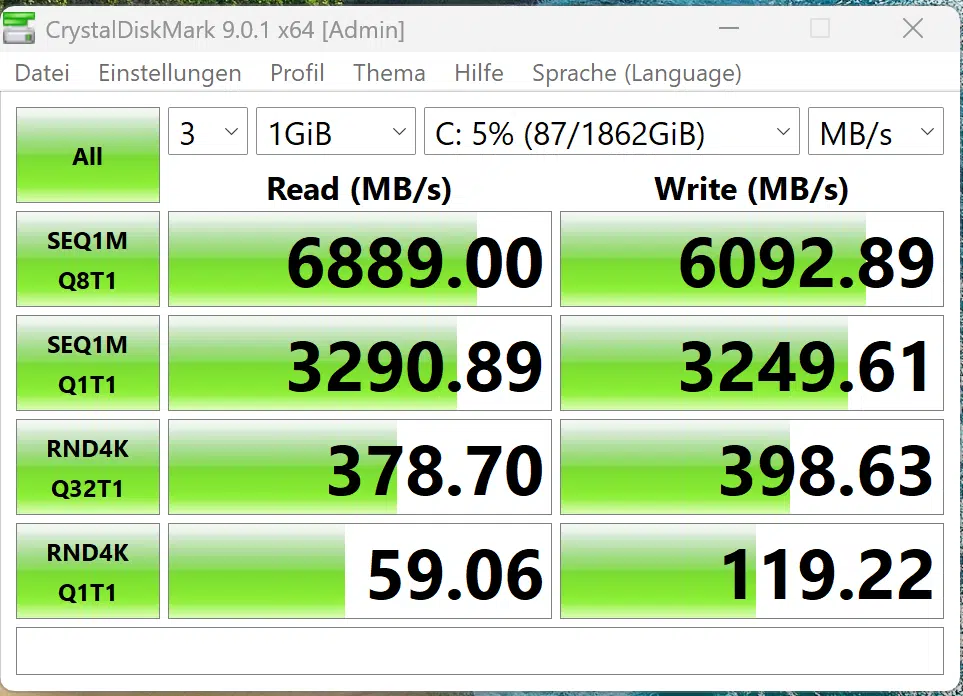 Die Standardanwendungen unter Windows stellen das System vor keine Herausforderung, sei es Browsen mit vielen Tabs, YouTube in 4K-Auflösung oder normale 4K-Dateien. Alles wird vom System flott und ohne Widerspruch wiedergegeben, dargestellt und geöffnet. Längere Ladezeiten liegen eigentlich kaum vor, wenn dann nur in großen Spielen. Die Lese- und Schreibraten der NVMe-M.2-SSD im 2280er-Format fallen ziemlich flott aus und stellen auch keinen Flaschenhals dar.