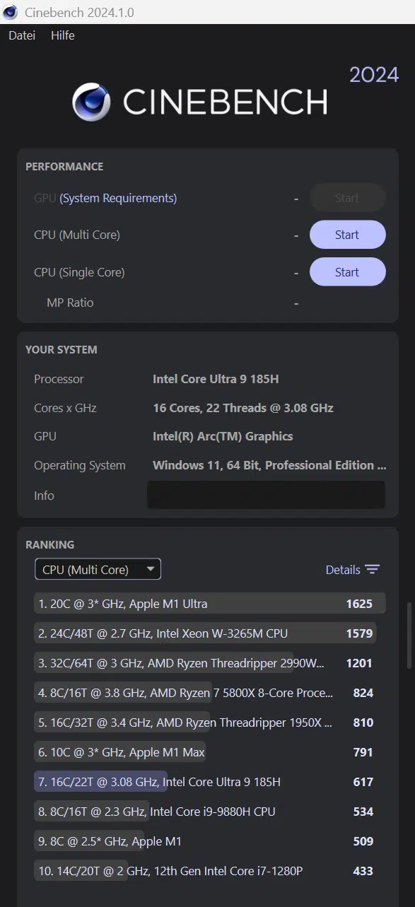 | CPU | Intel Core Ultra 9 185H 2,5-5,1 GHz, 45W TDP, (16 Kerne / 22 Threads) |