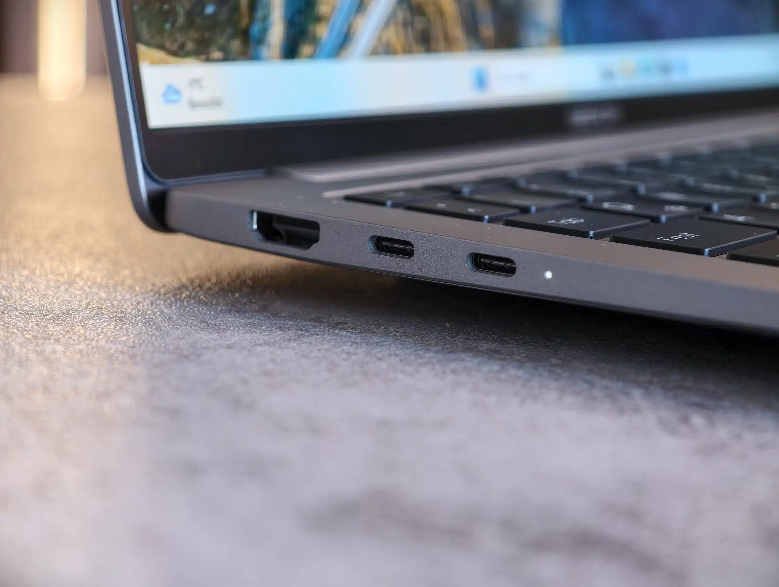 Die versprochenen 16 Stunden des Herstellers sind, wie so oft, eher ein theoretischer Wert für Schreibarbeiten bei minimaler Helligkeit. Im echten Leben, wenn man surft, Videos schaut oder mal was zockt, etwas herunterlädt oder Ähnliches, landet man eher bei 6 Stunden. Wer nur Texte tippt, kommt vielleicht auf die 10-14h. Das ist okay, aber kein Weltrekord. Geladen wird bequem per USB-C mit dem beiliegenden 65 Watt Netzteil.