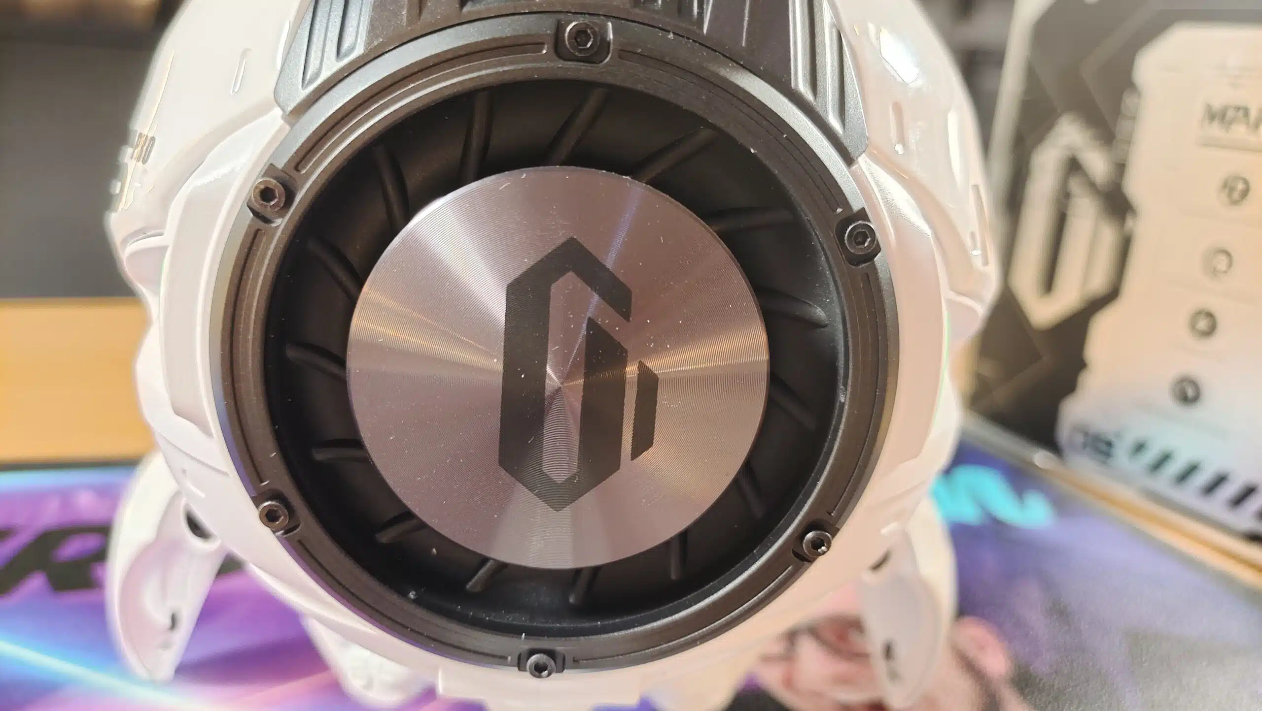 Ausgestattet ist der Lautsprecher mit einem Tief-/Mitteltöner mit einem Durchmesser von 6cm. Mit einem Durchmesser von 2cm sitzt dann noch ein Hochtöner mit drin. Auf der Rückseite des Cyborgs befindet sich dann noch ein Passivstrahler für druckvolle Tieftöne. Koppelt man den Monolautsprecher mit einem zweiten GravaStar Pro bekommt man auch einen Stereo-Sound.