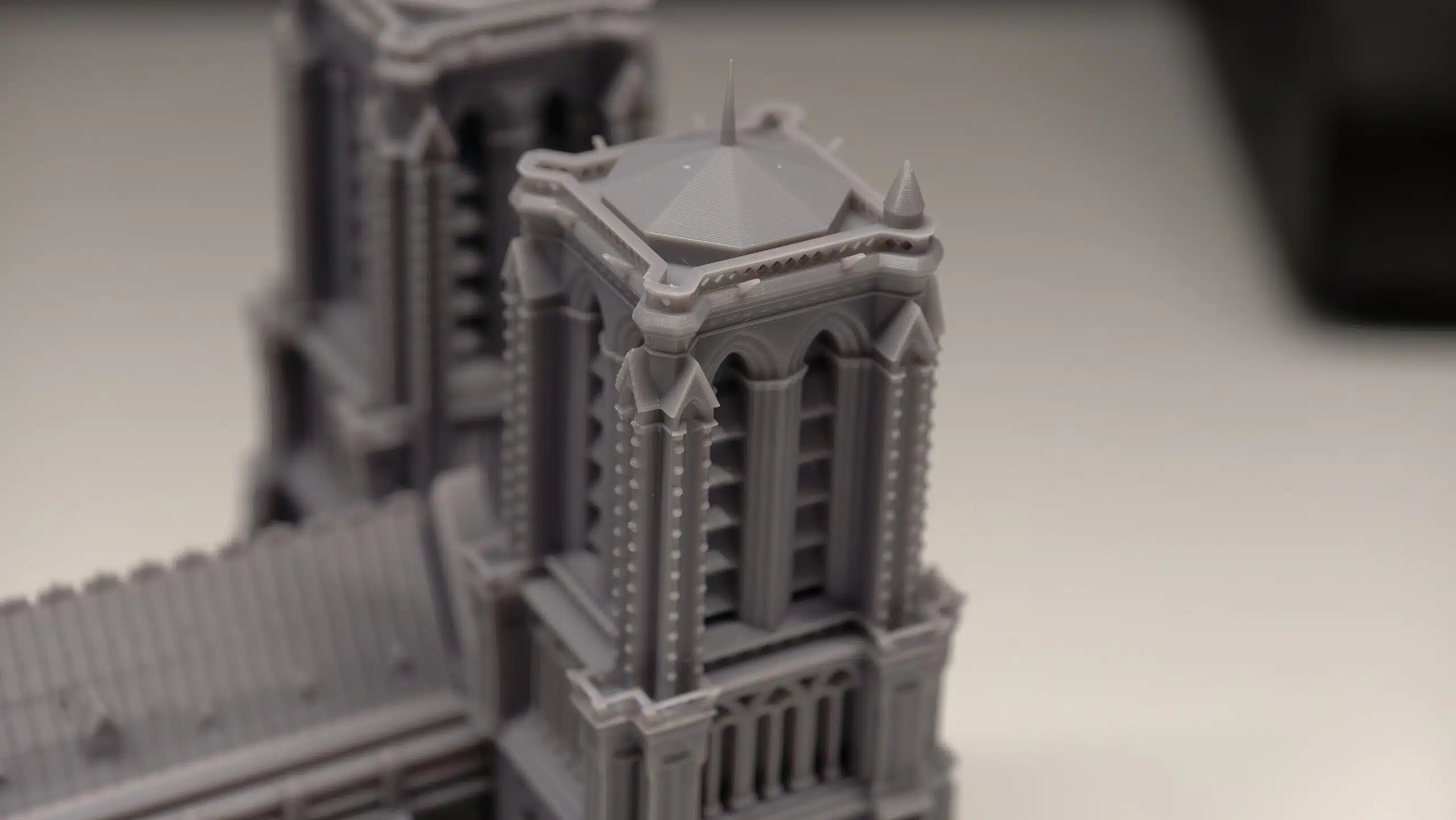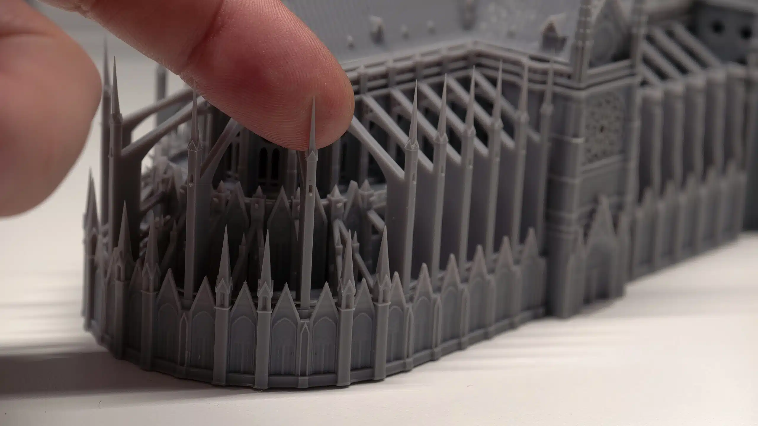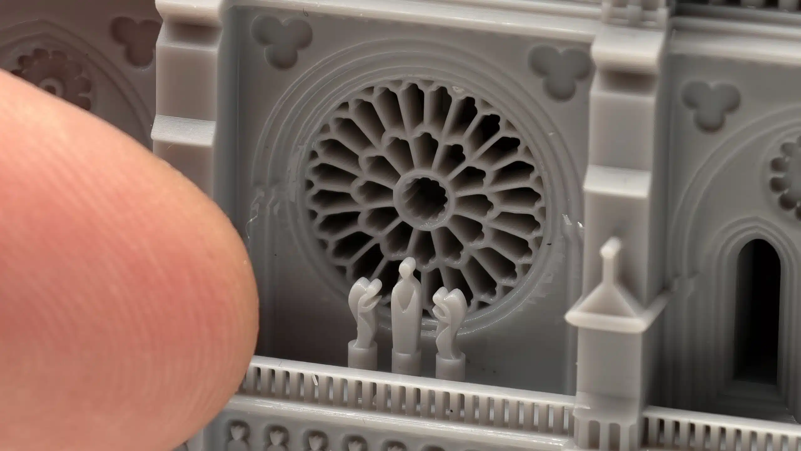 Große Sachen drucken kann ja jeder. Aber bei einem SLA 3D Drucker kommt es eben auch auf die Kleinigkeiten an. Mit etwas über 6 Stunden hab ich einen Teil der Notre-Dame de Paris Architektur gedruckt. Dieses Mal in 50 Mikrometer, also etwas „gröber“ als beim ersten Druck mit dem Drachenkopf aufgelöst. Aber schaut selbst: