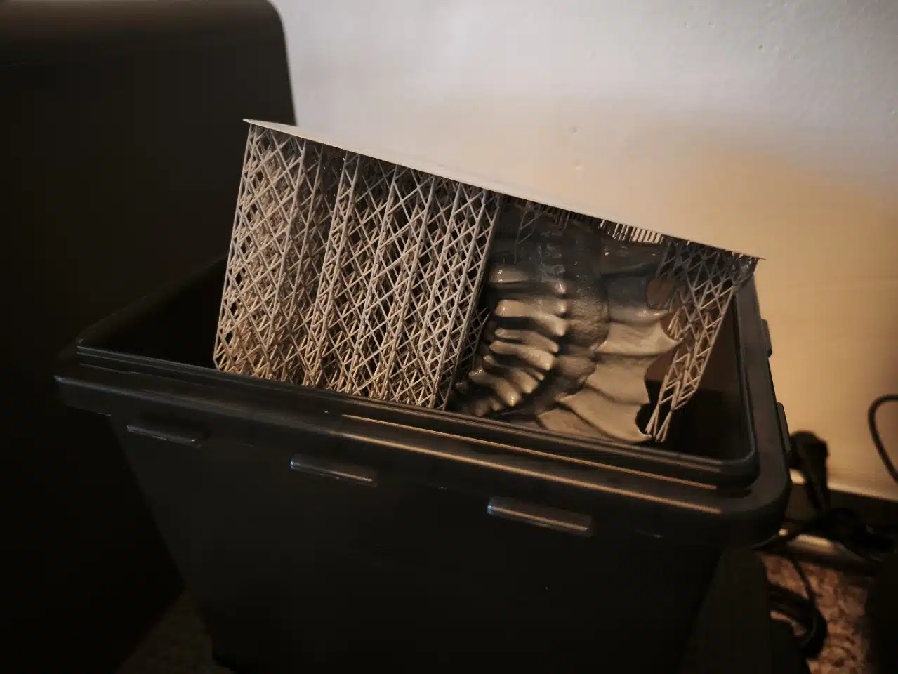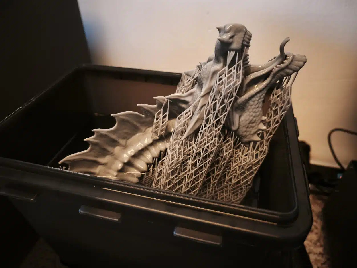 Also Handschuhe angezogen, den beiliegenden Spatel genommen und den Druck von der Platte gelöst. Der nächste Schritt ist das waschen in Isopropanol Alkohol und das Trennen des Supports. Wenn das Modell vom übergebliebenen Resin gereinigt ist kann man unter warmen Wasser bequem den Support entfernen. Falls ihr es noch nicht gehört oder gewusst habt: Resin gehört nicht in den Wasserkreislauf. Wobei es auch wasserlösliches Resin gibt, das hab ich aber zum Testen nicht vorliegen.
