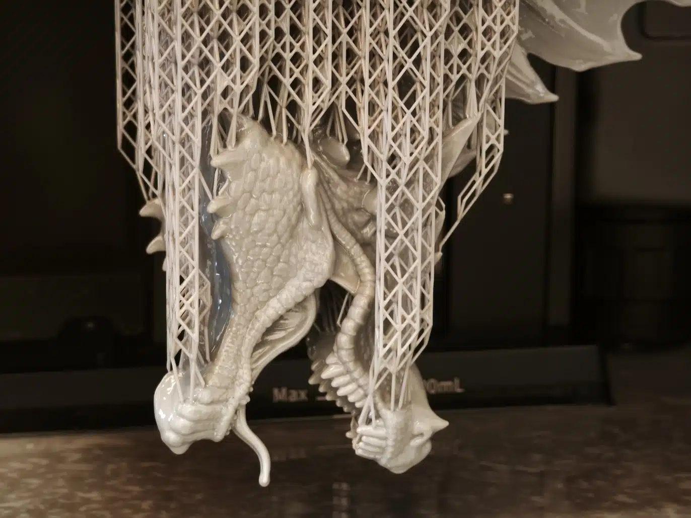 Da das Modell aber auch 2-3 Tage kopfüber an der Druckplatte hing, ist nicht mehr allzu viel Resin übergeblieben. Nach dem Reinigen drücke ich den Support einfach mit den Fingern ab, viele Spuren bleiben nicht über. Wie gesagt, unter warmen Wasser gehts sogar noch etwas besser ab.