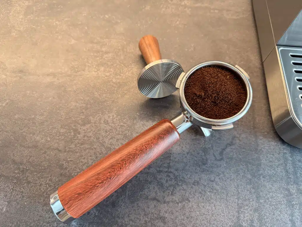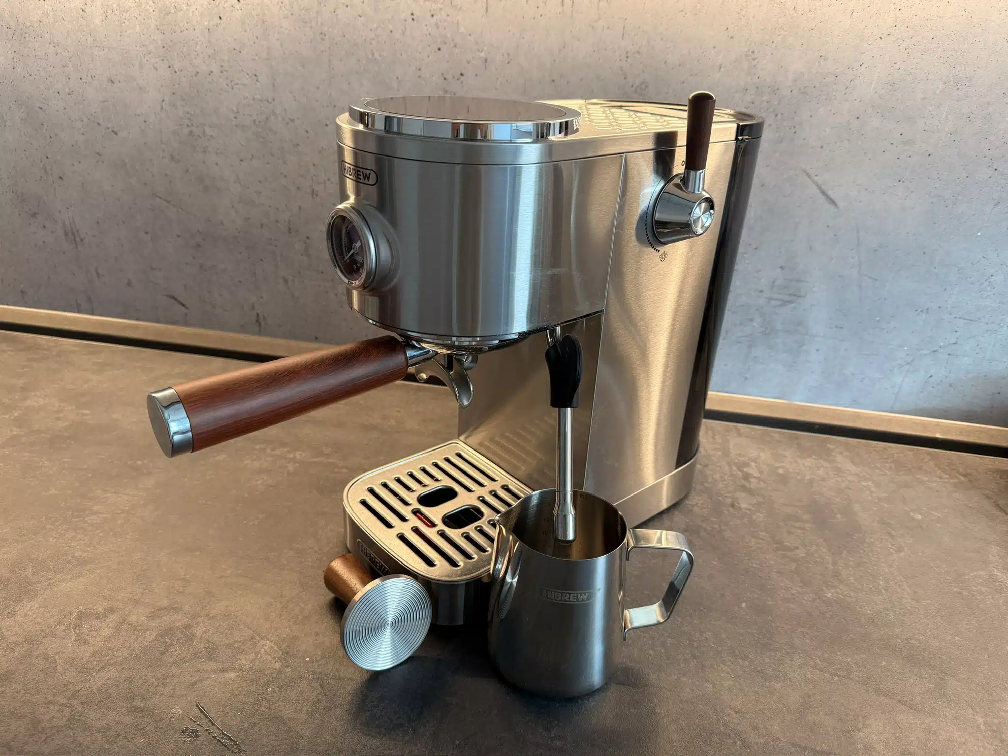 Hier zeigt sich, dass HiBREW Wert auf Haptik legt. Der 51-mm-Siebträger aus Edelstahl sitzt solide in der Brühgruppe, das Hebelventil aus Massivholz verleiht dem Gerät eine angenehme, fast handwerkliche Note.