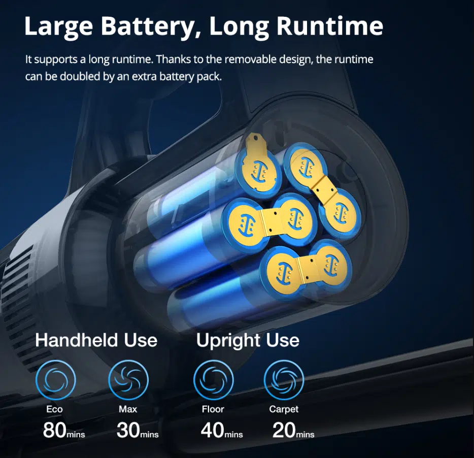 Die Akkulaufzeit wird mit 3800 mAh angegeben, womit der Sauger auf eine Arbeitszeit von bis zu 80 Minuten im Handheld Modus und bis zu 40 Minuten im Kombinationsmodus kommt. Zusätzlich ist der Akku noch wechselbar. Eine vollständige Akkuladung kann bis zu 5 Stunden dauern.