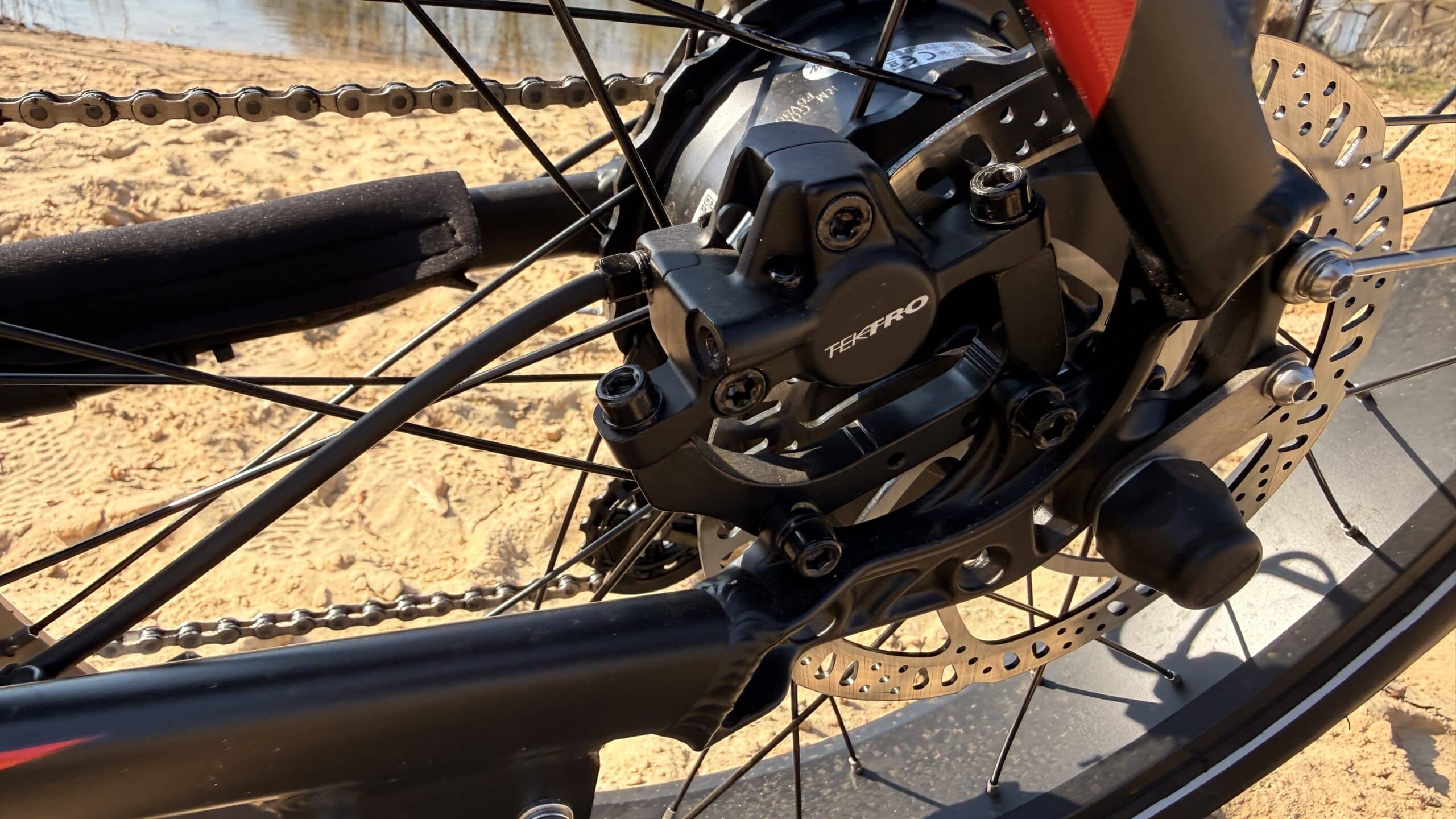 Die Tektro hydraulischen Scheibenbremsen mit 180-mm-Rotoren liefern kräftige Bremsleistung. Hydraulische Systeme haben den Vorteil, dass sie weniger Handkraft benötigen und gleichzeitig gut dosierbar bleiben. Gerade bei einem relativ schweren E-Bike ist das ein wichtiger Sicherheitsfaktor.
