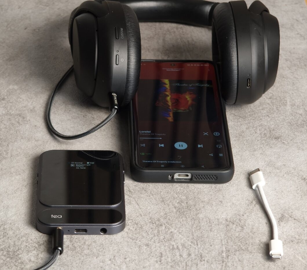 Die Verbindung ist denkbar einfach gelöst, gerade dann, wenn man die beiliegenden kurzen Typ-C oder Lightning Kabel (je nach Modellreihe) mit dem Smartphone und dem DAC verbindet. Nicht weniger einfacher, aber umso praktischer ist die Bluetooth-Verbindung zwischen Smartphone und dem Tea Pro DAC. Was bei beiden Anbindungsmöglichkeiten gleich bleibt: die Nutzung eines Kopfhörers über 3,5 mm oder 4,4 mm Klinke.